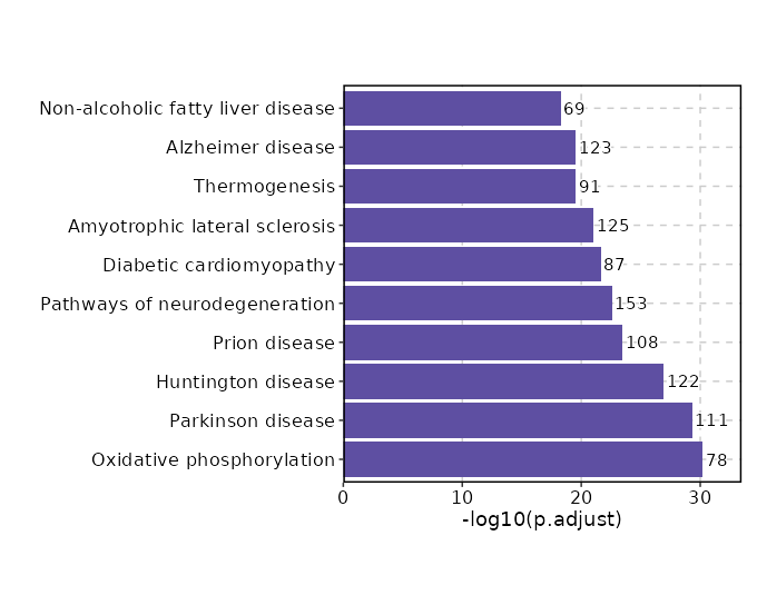Enrichment Analysis Oxidative phosphorylation 78/133 2.062e-33 6.412e-31 9.0131 678.3453 ATP6V1E1;PPA1;SDHB;SDHC;SDHA;UQCRQ;UQCRC2;UQCRC1;ATP6V0D1;NDUFB11;NDUFB10;UQCR10;UQCR11;COX6A1;COX8A;ATP6V0C;ATP6V0B;ATP6AP1;COX7A2L;ATP6V1B2;ATP6V1A;ATP6V1D;UQCRB;ATP5MC3;COX7A2;ATP5MC2;UQCRH;COX15;ATP6V1F;CYC1;ATP6V1H;ATP6V0A2;COX10;ATP5F1D;ATP5F1E;COX6C;NDUFS8;NDUFS7;NDUFS6;NDUFS5;NDUFS4;NDUFS3;NDUFS2;ATP5ME;COX7C;COX7B;NDUFB7;NDUFB5;NDUFB4;NDUFB3;NDUFB1;UQCRFS1;COX4I1;ATP5MG;ATP5MF;NDUFA9;ATP5PF;NDUFA8;NDUFA7;ATP5PD;NDUFA6;NDUFA5;ATP5PB;NDUFA4;NDUFA3;NDUFA2;NDUFA1;COX6B1;NDUFAB1;COX5A;NDUFA12;NDUFA13;NDUFA11;TCIRG1;COX5B;ATP5F1A;ATP5F1B;ATP5F1C 1 KEGG_2021_Human Parkinson disease 111/249 2.994e-32 4.656e-30 5.1502 373.8306 PSMC6;PSMC4;PSMC3;UQCRC2;BAX;PSMC1;UQCRC1;CALM3;UQCR10;UQCR11;UBE2L6;UBE2L3;PSMD9;PSMD7;PSMD8;PSMD6;PSMD4;COX8A;DAXX;COX7A2L;ATF4;UBE2J1;UBE2J2;PLCG1;PRKACB;ATP5F1D;ATP5F1E;COX6C;UBE2G1;COX7C;COX7B;ATP5PF;ATP5PD;ATP5PB;COX6B1;PSMA6;PSMA7;PSMA4;PSMA5;PSMA2;NDUFAB1;PSMA1;COX5A;NDUFA12;NDUFA13;NDUFA11;COX5B;GNAI2;PSMB7;ATP5F1A;ATP5F1B;ATP5F1C;PSMB6;PSMB3;PSMB4;PSMB1;PSMB2;SDHB;SDHC;SDHA;UQCRQ;PPIF;NDUFB11;NDUFB10;PARK7;COX6A1;SEM1;BCL2L1;GNAS;TXN2;UQCRB;ATP5MC3;COX7A2;ATP5MC2;UQCRH;UBB;CYC1;NDUFS8;NDUFS7;NDUFS6;ADORA2A;NDUFS5;NDUFS4;NDUFS3;NDUFS2;PSMD13;NDUFB7;UBA7;NDUFB5;NDUFB4;ITPR2;NDUFB3;NDUFB1;UQCRFS1;CASP3;COX4I1;NDUFA9;NDUFA8;NDUFA7;NDUFA6;NDUFA5;ADRM1;NDUFA4;NDUFA3;NDUFA2;NDUFA1;VDAC3;VDAC1;SLC25A6;SLC25A5;CAMK2D 2 KEGG_2021_Human Huntington disease 122/306 1.114e-29 1.154e-27 4.2515 283.4374 POLR2J3;ATG13;PSMC6;PSMC4;PSMC3;UQCRC2;BAX;PSMC1;UQCRC1;STX1A;UQCR10;UQCR11;PSMD9;PSMD7;PSMD8;PSMD6;PSMD4;NRBF2;AP2S1;COX8A;CREBBP;COX7A2L;ATG2A;ATP5F1D;ATP5F1E;COX6C;COX7C;COX7B;CLTC;CLTB;CLTA;ACTR1A;ATP5PF;ATP5PD;ATP5PB;COX6B1;PSMA6;PSMA7;PSMA4;PSMA5;PSMA2;NDUFAB1;PSMA1;HIP1;COX5A;NDUFA12;NDUFA13;NDUFA11;AP2A1;COX5B;PSMB7;ATP5F1A;ATP5F1B;ATP5F1C;PSMB6;PSMB3;PSMB4;EP300;PSMB1;PSMB2;SDHB;SDHC;SDHA;UQCRQ;PPIF;NDUFB11;NDUFB10;COX6A1;SEM1;UQCRB;ATP5MC3;COX7A2;ATP5MC2;UQCRH;CYC1;AP2M1;MAP2K7;WIPI1;WIPI2;NDUFS8;NDUFS7;NDUFS6;NDUFS5;NDUFS4;NDUFS3;NDUFS2;PSMD13;NDUFB7;NDUFB5;NDUFB4;NDUFB3;NDUFB1;UQCRFS1;CASP3;COX4I1;NDUFA9;NDUFA8;NDUFA7;NDUFA6;NDUFA5;ADRM1;NDUFA4;NDUFA3;NDUFA2;NDUFA1;REST;VDAC3;VDAC1;SLC25A6;SLC25A5;BECN1;DCTN6;DCTN3;HDAC1;DCTN2;DCTN5;RB1CC1;AMBRA1;POLR2A;POLR2E;POLR2G;POLR2J 3 KEGG_2021_Human Prion disease 108/273 4.456e-26 3.464e-24 4.1797 243.9805 BAD;MAPK12;PSMC6;PSMC4;PSMC3;UQCRC2;BAX;PSMC1;UQCRC1;ATF2;UQCR10;UQCR11;PSMD9;PSMD7;PSMD8;PSMD6;PSMD4;COX8A;COX7A2L;CSNK2B;ATF4;PRKACB;ATP5F1D;ATP5F1E;COX6C;COX7C;COX7B;ATP5PF;ATP5PD;ATP5PB;COX6B1;PSMA6;PSMA7;PSMA4;PSMA5;PSMA2;NDUFAB1;PSMA1;COX5A;NDUFA12;NDUFA13;NDUFA11;COX5B;PSMB7;ATP5F1A;ATP5F1B;ATP5F1C;PSMB6;PSMB3;PSMB4;PSMB1;PSMB2;RAC2;SDHB;SDHC;SDHA;UQCRQ;PPIF;NDUFB11;ATF6B;NDUFB10;COX6A1;CYBA;SEM1;NOTCH1;UQCRB;ATP5MC3;COX7A2;ATP5MC2;UQCRH;CYC1;NDUFS8;NDUFS7;NDUFS6;NDUFS5;NDUFS4;NDUFS3;NDUFS2;GSK3B;PSMD13;NDUFB7;NDUFB5;NDUFB4;ITPR2;NDUFB3;NDUFB1;PIK3R3;UQCRFS1;CASP3;COX4I1;NDUFA9;NDUFA8;NDUFA7;NDUFA6;NDUFA5;ADRM1;NDUFA4;NDUFA3;NDUFA2;NDUFA1;VDAC3;VDAC1;SLC25A6;SLC25A5;PIK3CD;CCL5;MAPK1;FYN 4 KEGG_2021_Human Pathways of neurodegeneration 153/475 4.387e-25 2.729e-23 3.0577 171.4971 BAD;ATG13;PSMC6;CCS;PSMC4;PSMC3;UQCRC2;BAX;PSMC1;UQCRC1;PSMD9;PSMD7;PSMD8;PSMD6;PSMD4;NRBF2;GABARAPL2;DAXX;GABARAPL1;PRKCB;ATG2A;ATF4;GABARAP;TBK1;PLCG1;CSNK1A1;ATXN1;COX6B1;PSMA6;PSMA7;PSMA4;PSMA5;PSMA2;PSMA1;NDUFA12;NDUFA13;NDUFA11;PSMB7;PSMB6;PSMB3;PSMB4;PSMB1;PSMB2;BID;UQCRQ;PARK7;TANK;NRAS;MAP2K2;MAP2K3;BCL2L1;UQCRB;FASLG;UQCRH;MAP2K7;WIPI1;WIPI2;TNFRSF1A;TNFRSF1B;CDK5;NDUFB7;NDUFB5;NDUFB4;ITPR2;NDUFB3;NDUFB1;COX4I1;NDUFA9;NDUFA8;NDUFA7;NDUFA6;NDUFA5;ADRM1;NDUFA4;NDUFA3;NDUFA2;NDUFA1;SLC25A6;SLC25A5;BECN1;AMBRA1;HSD17B10;BAK1;MAPK12;CALM3;STX1A;UQCR10;UQCR11;UBE2L6;UBE2L3;COX8A;COX7A2L;CSNK2B;UBE2J1;UBE2J2;ATP5F1D;ATP5F1E;COX6C;UBE2G1;COX7C;COX7B;ACTR1A;ATP5PF;ATP5PD;ATP5PB;NDUFAB1;HIP1;COX5A;COX5B;ATP5F1A;ATP5F1B;ATP5F1C;RAB8A;SDHB;SDHC;SDHA;PPIF;NDUFB11;NDUFB10;COX6A1;CAPN1;SEM1;VCP;ATP5MC3;PSEN2;COX7A2;ATP5MC2;UBB;CYC1;NDUFS8;NDUFS7;NDUFS6;NDUFS5;NDUFS4;NDUFS3;NDUFS2;GSK3B;PSMD13;UBA7;CASP7;UQCRFS1;CASP3;CAT;VDAC3;KRAS;VDAC1;CAMK2D;DCTN6;DCTN3;DCTN2;DCTN5;RB1CC1;MAPK1 5 KEGG_2021_Human Diabetic cardiomyopathy 87/203 4.347e-24 2.253e-22 4.7655 256.3485 MAPK12;UQCRC2;UQCRC1;PDHB;UQCR10;UQCR11;AKT1;AKT2;COX8A;PRKCB;COX7A2L;ATP5F1D;ATP5F1E;COX6C;COX7C;COX7B;CTSD;ATP5PF;PPARA;ATP5PD;ATP5PB;PARP1;COX6B1;NDUFAB1;COX5A;NDUFA12;NDUFA13;NDUFA11;COX5B;ATP5F1A;ATP5F1B;ATP5F1C;RAC2;G6PD;SDHB;SDHC;PPP1CA;SDHA;UQCRQ;PPIF;NDUFB11;NDUFB10;COX6A1;PPP1CC;PTPA;CYBA;UQCRB;ATP5MC3;COX7A2;ATP5MC2;UQCRH;MPC1;MPC2;CYC1;TGFBR2;NDUFS8;NDUFS7;NDUFS6;NDUFS5;NDUFS4;NDUFS3;NDUFS2;GSK3B;NDUFB7;NDUFB5;NDUFB4;NDUFB3;NDUFB1;PIK3R3;UQCRFS1;COX4I1;NDUFA9;NDUFA8;NDUFA7;NDUFA6;NDUFA5;NDUFA4;NDUFA3;NDUFA2;NDUFA1;VDAC3;VDAC1;SLC25A6;SLC25A5;GAPDH;CAMK2D;PIK3CD 6 KEGG_2021_Human Amyotrophic lateral sclerosis 125/364 2.03e-23 9.019e-22 3.3466 174.863 BAD;ATG13;MAPK12;PSMC6;CCS;PSMC4;PSMC3;UQCRC2;BAX;PSMC1;UQCRC1;PFN1;UQCR10;UQCR11;PSMD9;ACTB;PSMD7;PSMD8;PSMD6;PSMD4;NRBF2;COX8A;GABARAPL2;DAXX;GABARAPL1;COX7A2L;SETX;ATG2A;ATF4;GABARAP;TBK1;ATP5F1D;ATP5F1E;COX6C;COX7C;COX7B;ACTR1A;ATP5PF;ATP5PD;ATP5PB;COX6B1;PSMA6;PSMA7;PSMA4;PSMA5;PSMA2;NDUFAB1;PSMA1;COX5A;NDUFA12;NDUFA13;NDUFA11;COX5B;PSMB7;ATP5F1A;ATP5F1B;ATP5F1C;PSMB6;PSMB3;PSMB4;PSMB1;PSMB2;RAB8A;BID;SDHB;SDHC;SDHA;UQCRQ;SRSF3;NDUFB11;NDUFB10;TANK;COX6A1;MAP2K3;SEM1;BCL2L1;VCP;UQCRB;ACTG1;ATP5MC3;COX7A2;ATP5MC2;UQCRH;CYC1;WIPI1;WIPI2;TNFRSF1A;TNFRSF1B;NDUFS8;NDUFS7;NDUFS6;NDUFS5;NDUFS4;NDUFS3;NDUFS2;PSMD13;NDUFB7;NDUFB5;NDUFB4;NDUFB3;NDUFB1;UQCRFS1;CASP3;COX4I1;CASP1;NDUFA9;NDUFA8;NDUFA7;NDUFA6;NDUFA5;ADRM1;NDUFA4;NDUFA3;NDUFA2;NDUFA1;CAT;VDAC1;BECN1;DCTN6;DCTN3;DCTN2;DCTN5;RB1CC1;AMBRA1;HNRNPA3 7 KEGG_2021_Human Thermogenesis 91/232 7.166e-22 2.786e-20 4.1009 199.6632 ACSL5;ACSL4;MAPK12;UQCRC2;UQCRC1;ATF2;SMARCB1;UQCR10;UQCR11;ADCY7;ACTB;COX8A;COX7A2L;PRKACB;SIRT6;ATP5F1D;ATP5F1E;COX6C;ATP5ME;COX7C;COX7B;ATP5MG;ATP5MF;ATP5PF;ATP5