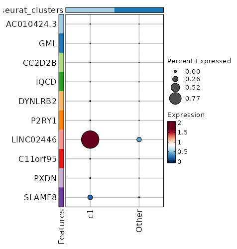Cluster seurat_clusters: c1 Markers Showing top 100 markers ordered by p_val_adj ascendingly, then abs(avg_log2FC) descendingly. Use 'Download the entire data' button to download all significant markers by 'p_val_adj < 0.05 & avg_log2FC > 0'.
