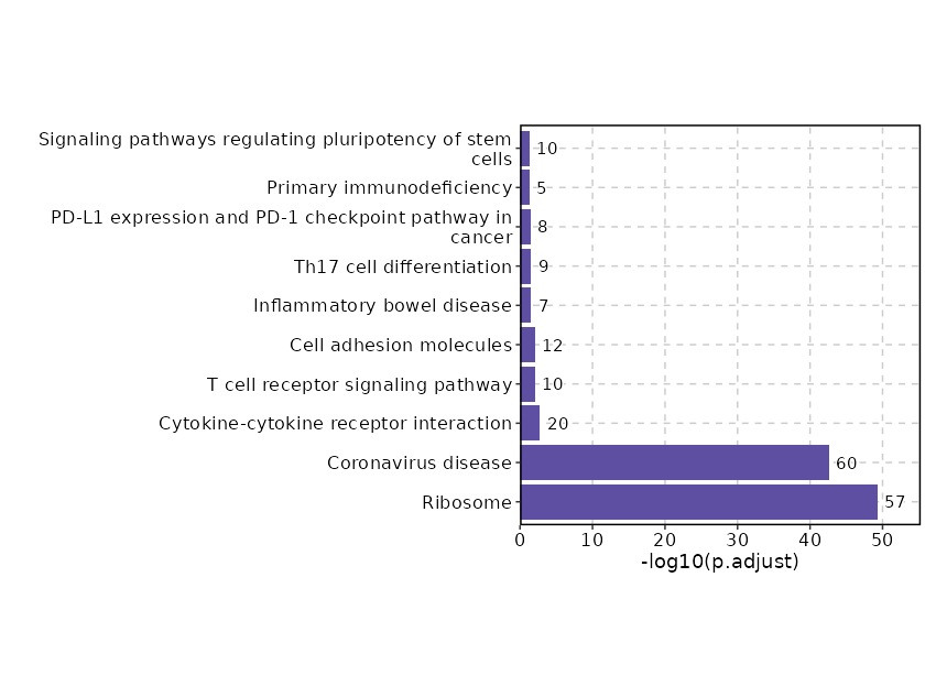 Enrichment Analysis Ribosome 72/158 3.352e-78 8.447e-76 45.8255 8174.8978 RPL22;RPS8;RPL21;RPS9;RPS6;RPS7;RPSA;FAU;RPL26;RPL28;RPL27;RPL29;RPL11;RPL10;RPL13;RPL12;RPL14;RPS5;RPL17;RPS2;RPS3;RPL19;RPL18;RPL41;RPS27;RPS29;RPS28;RPL27A;RPS21;RPS20;RPS23;RPS25;RPS24;RPL5;RPL6;RPL3;RPL31;RPL30;RPL4;RPL32;RPL35;RPL34;RPL9;RPL7;RPL8;RPS16;RPS18;RPS19;RPL37;RPL36;RPL39;RPS10;RPL38;RPS12;RPS14;RPS13;RPL13A;RPS3A;RPL37A;RPL36A;RPS15A;RPS27A;RPL35A;RPL23A;UBA52;RPLP0;RPLP2;RPLP1;RPL10A;RPS4X;RPL18A;RPL7A 1 KEGG_2021_Human Coronavirus disease 78/232 3.077e-72 3.877e-70 28.1003 4627.047 RPL22;RPL21;RPL26;RPL28;RPL27;RPL29;RPL11;RPL10;RPL13;C3AR1;RPL12;RPL14;RPL17;RPL19;RPL18;RPL41;RPS27;RPS29;RPS28;RPL27A;RPS21;RPS20;RPS23;RPS25;RPS24;RPL5;RPL6;RPL3;RPL31;RPL30;RPL4;RPL32;RPL35;RPL34;RPL9;RPL7;RPL8;RPS16;RPS18;RPS19;RPL37;RPL36;RPL39;RPS10;RPL38;RPS12;RPS14;RPS13;JUN;RPS15A;RPS27A;FOS;RPLP0;RPLP2;RPLP1;RPL18A;RPS8;RPS9;RPS6;RPS7;RPSA;FAU;TNF;RPS5;RPS2;RPS3;RPL13A;RPS3A;IL2;NFKBIA;RPL37A;RPL36A;RPL35A;RPL23A;UBA52;RPL10A;RPS4X;RPL7A 2 KEGG_2021_Human Th17 cell differentiation 13/107 0 0 6.491 94.4188 CD4;AHR;IL23R;RORC;GATA3;RORA;JUN;IL2;NFKBIA;RARA;IFNGR1;FOS;HSP90AB1 3 KEGG_2021_Human Salmonella infection 19/249 0 0.0001 3.9066 51.4258 AHNAK;MYL12B;AKT3;MYC;S100A10;MYL12A;ANXA2;JUN;FOS;TUBA1A;TUBA1C;TNF;RPS3;M6PR;NFKBIA;BCL2;TRADD;DYNLT3;HSP90AB1 4 KEGG_2021_Human Inflammatory bowel disease 9/65 0 0.0005 7.4857 86.5038 JUN;IL2;TNF;IFNGR1;STAT4;IL23R;RORC;GATA3;RORA 5 KEGG_2021_Human Apoptosis 13/142 0 0.0005 4.7214 53.5886 ERN1;TNF;LMNA;AKT3;CTSB;JUN;NFKBIA;BCL2;TRADD;MCL1;FOS;TUBA1A;TUBA1C 6 KEGG_2021_Human Lipid and atherosclerosis 16/215 0 0.0006 3.7807 41.5414 CALM1;AKT3;ABCA1;XBP1;JUN;FOS;CD40LG;PLCB1;ERN1;NCF1;TNF;NCF4;HSPA5;NFKBIA;BCL2;HSP90AB1 7 KEGG_2021_Human JAK-STAT signaling pathway 13/162 0 0.0015 4.0834 40.6332 AKT3;MYC;CISH;IL7R;IL23R;IL5RA;IL2;BCL2;SOCS2;MCL1;IFNGR1;STAT4;FHL1 8 KEGG_2021_Human Protein processing in endoplasmic reticulum 13/171 0.0001 0.0023 3.849 36.1592 ERN1;PPP1R15A;XBP1;HSPA5;SSR4;BCL2;TRAM1;SEC61B;BCAP31;SVIP;DAD1;HSP90AB1;UBQLN4 9 KEGG_2021_Human IL-17 signaling pathway 9/94 0.0002 0.0047 4.9244 42.3336 JUN;NFKBIA;TRADD;TNFAIP3;TNF;JUND;FOS;FOSB;HSP90AB1 10 KEGG_2021_Human Ferroptosis 6/41 0.0002 0.005 7.9365 66.8009 GPX4;PRNP;ACSL6;SLC40A1;FTH1;SLC39A8 11 KEGG_2021_Human Leishmaniasis 8/77 0.0002 0.005 5.3839 44.9056 JUN;EEF1A1;NFKBIA;NCF1;TNF;IFNGR1;FOS;NCF4 12 KEGG_2021_Human Kaposi sarcoma-associated herpesvirus infection 13/193 0.0003 0.0054 3.3748 27.6361 CALM1;AKT3;MYC;JUN;CD200R1;RPS27A;IFNGR1;FOS;ZFP36;NFKBIA;CDK6;TRADD;UBA52 13 KEGG_2021_Human Chagas disease 9/102 0.0003 0.0062 4.499 35.8999 TNF;AKT3;JUN;IL2;NFKBIA;IFNGR1;FOS;PLCB1;PPP2R2B 14 KEGG_2021_Human NF-kappa B signaling pathway 9/104 0.0004 0.0064 4.4038 34.5042 TNF;TNFSF14;NFKBIA;BCL2;TRADD;TNFAIP3;LTB;CD40LG;TNFSF13B 15 KEGG_2021_Human Osteoclast differentiation 10/127 0.0004 0.0064 3.978 31.033 NCF1;TNF;AKT3;JUND;NCF4;JUN;NFKBIA;IFNGR1;FOS;FOSB 16 KEGG_2021_Human Th1 and Th2 cell differentiation 8/92 0.0008 0.011 4.419 31.5155 JUN;IL2;NFKBIA;CD4;IFNGR1;STAT4;FOS;GATA3 17 KEGG_2021_Human Fluid shear stress and atherosclerosis 10/139 0.0008 0.011 3.6058 25.5726 NCF1;CALM1;TNF;AKT3;MGST3;JUN;DUSP1;BCL2;FOS;HSP90AB1 18 KEGG_2021_Human Measles 10/139 0.0008 0.011 3.6058 25.5726 SLAMF1;AKT3;JUN;IL2;NFKBIA;CDK6;BCL2;TRADD;TNFAIP3;FOS 18 KEGG_2021_Human Pathways in cancer 23/531 0.0012 0.0148 2.1312 14.3817 AKT3;MYC;JUN;RARA;IFNGR1;STAT4;FOS;PLCB1;IL5RA;CDK6;BCL2;HSP90AB1;CALM1;FLT3LG;IL23R;MGST3;PTGER2;PTGER4;CXCR4;IL7R;AXIN2;IL2;NFKBIA 20 KEGG_2021_Human