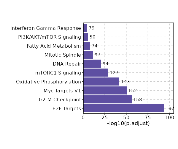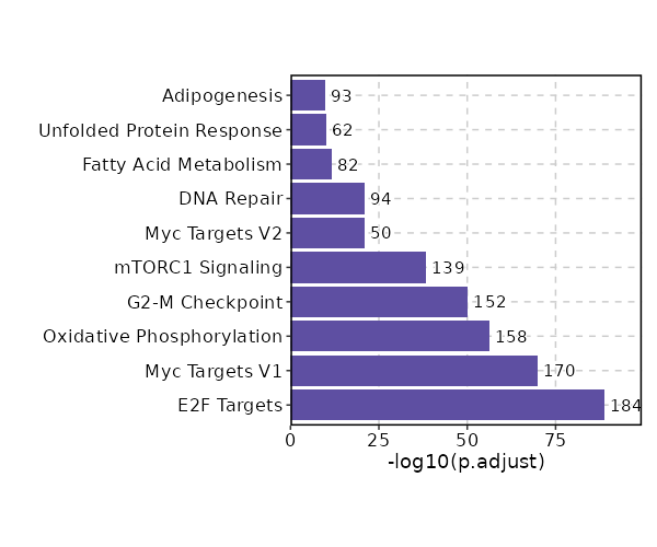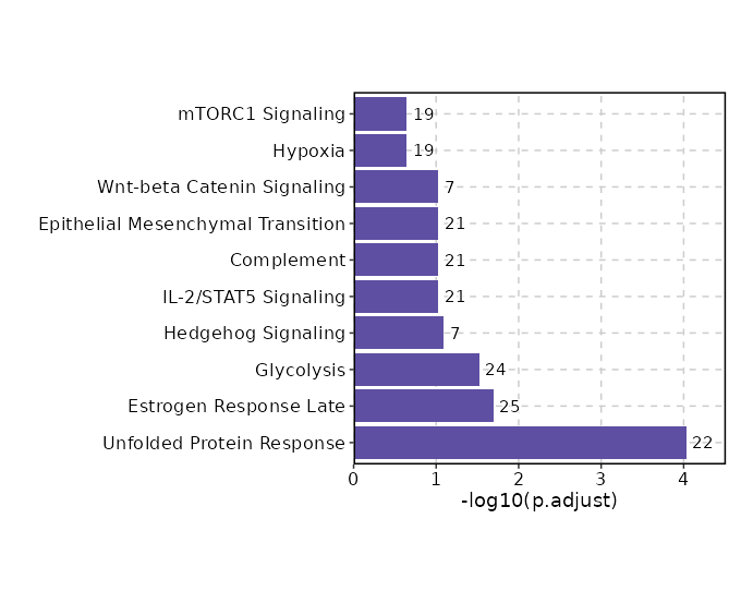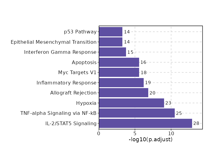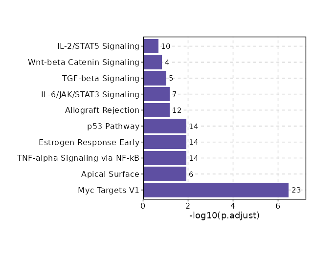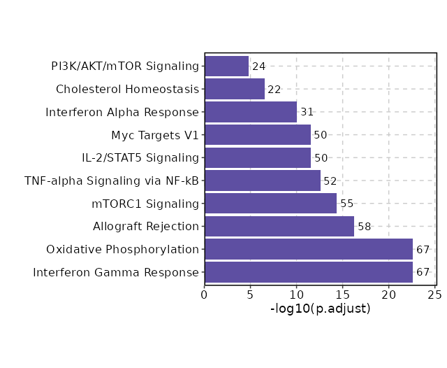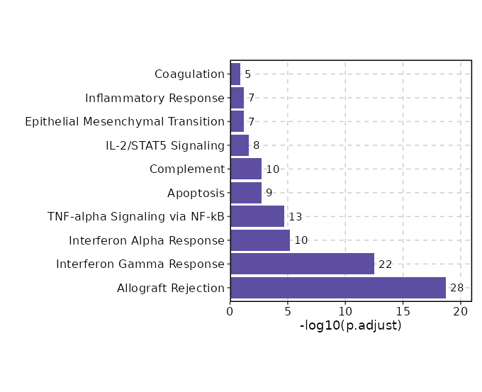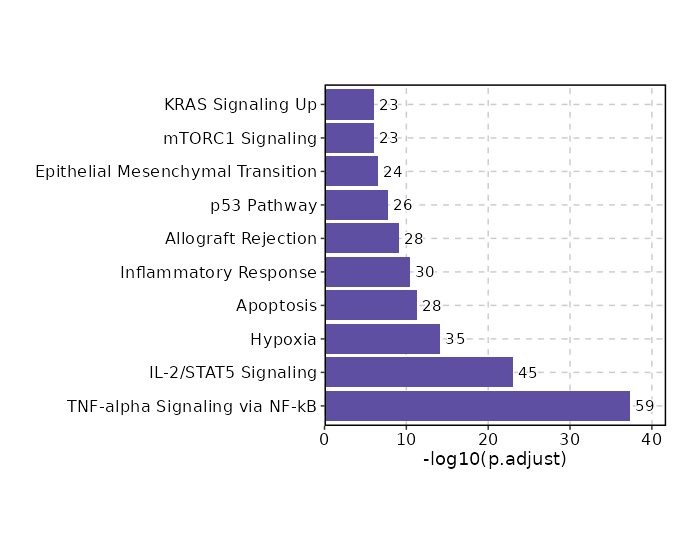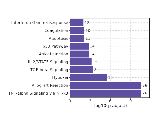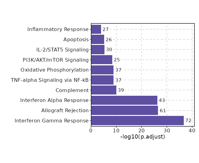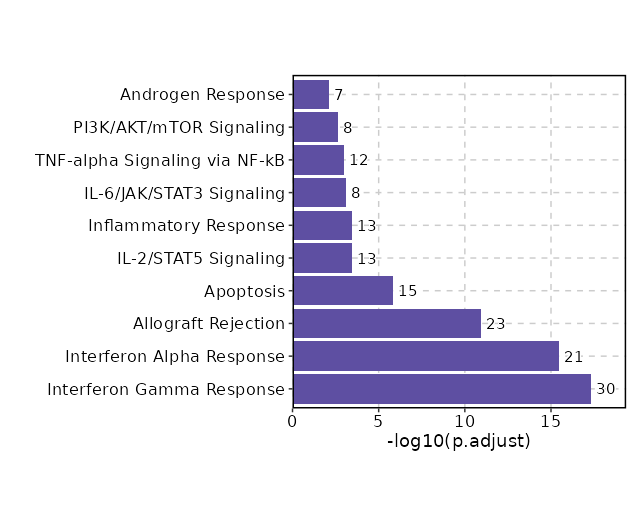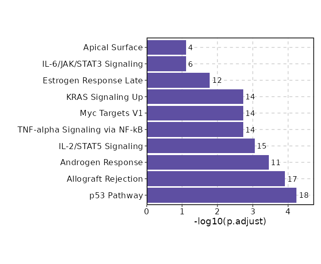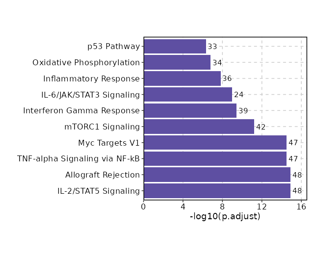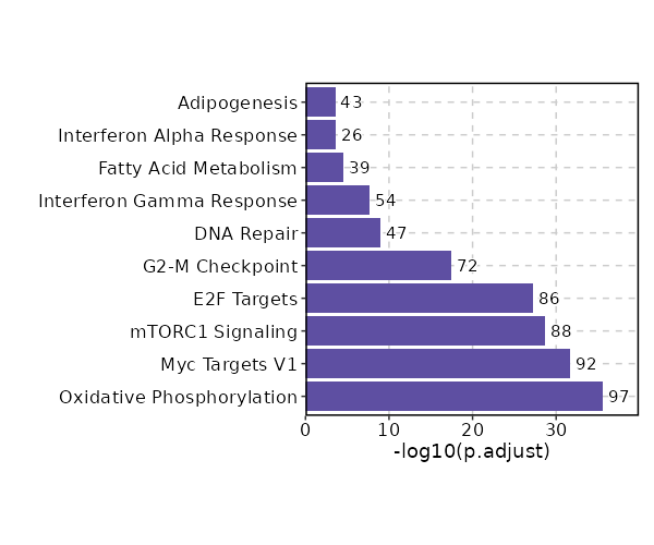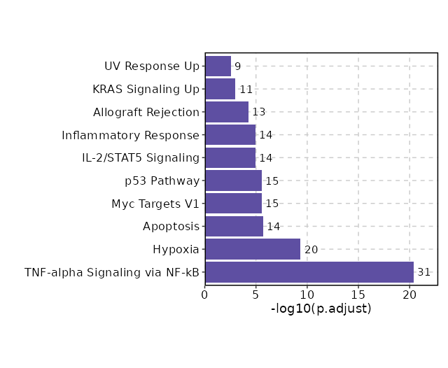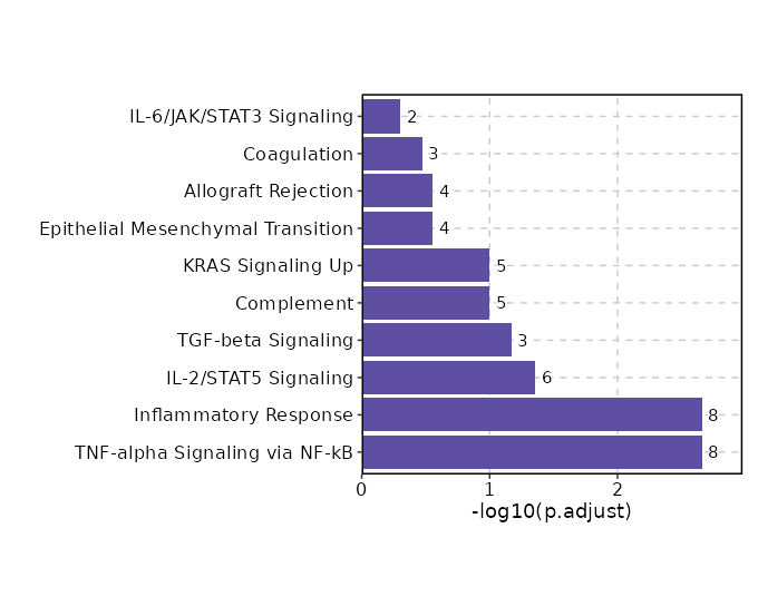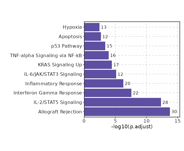 The bar plot shows the top enriched terms in database 'MSigDB_Hallmark_2020', the x-axis shows the -log10 of the adjusted p-values, and the y-axis shows the term names. The number next to each bar indicates the overlap gene count.