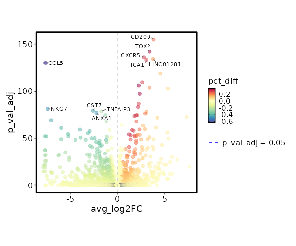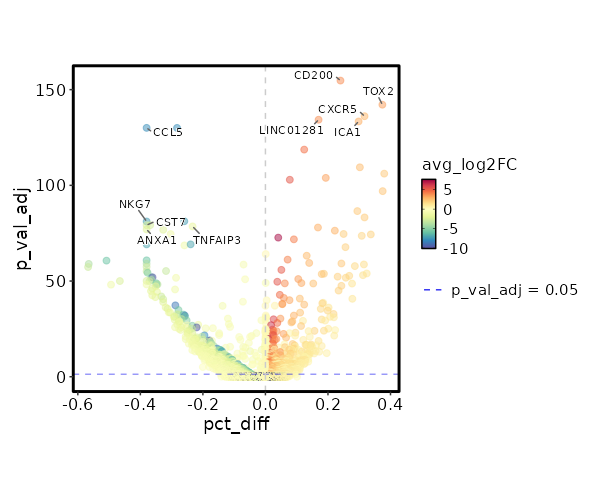 5.554e-160 3.8271 0.269 0.029 1.863e-155 CD200 c10 2.229e-147 3.4058 0.49 0.116 7.476e-143 TOX2 c10 2.263e-141 2.7725 0.384 0.067 7.589e-137 CXCR5 c10 1.604e-139 3.7845 0.184 0.014 5.38e-135 LINC01281 c10 1.25e-138 3.029 0.361 0.063 4.193e-134 ICA1 c10 6.298e-124 4.5357 0.131 0.007 2.112e-119 CPM c10 1.115e-114 2.6037 0.382 0.08 3.741e-110 TIAM1 c10 2.328e-111 2.2462 0.565 0.185 7.808e-107 TOX c10 3.737e-109 3.3776 0.222 0.029 1.253e-104 AC004585.1 c10 3.589e-108 5.3248 0.08 0.002 1.204e-103 KSR2 c10 3.159e-102 2.3373 0.59 0.215 1.059e-97 PASK c10 8.413e-92 2.2371 0.402 0.108 2.822e-87 TBC1D4 c10 1.735e-88 2.1802 0.465 0.148 5.818e-84 SESN3 c10 3.272e-83 3.0492 0.198 0.03 1.097e-78 IGFBP4 c10 1.414e-81 2.9091 0.284 0.062 4.741e-77 AC012645.3 c10 7.749e-80 2.0776 0.329 0.079 2.599e-75 ACTN1 c10 1.338e-79 1.9594 0.627 0.29 4.488e-75 IL6ST c10 6.925e-79 1.7884 0.449 0.141 2.323e-74 IL6R c10 6.209e-78 7.3207 0.041 0 2.082e-73 PVALB c10 4.764e-77 4.2254 0.098 0.007 1.598e-72 DRAIC c10