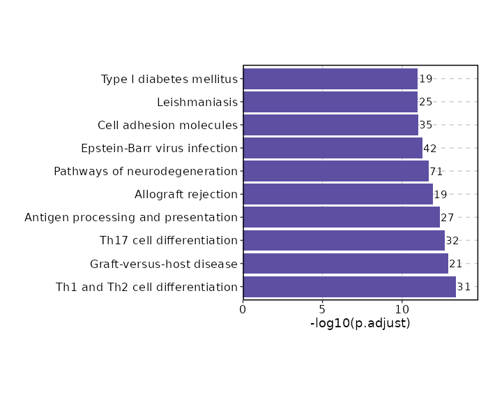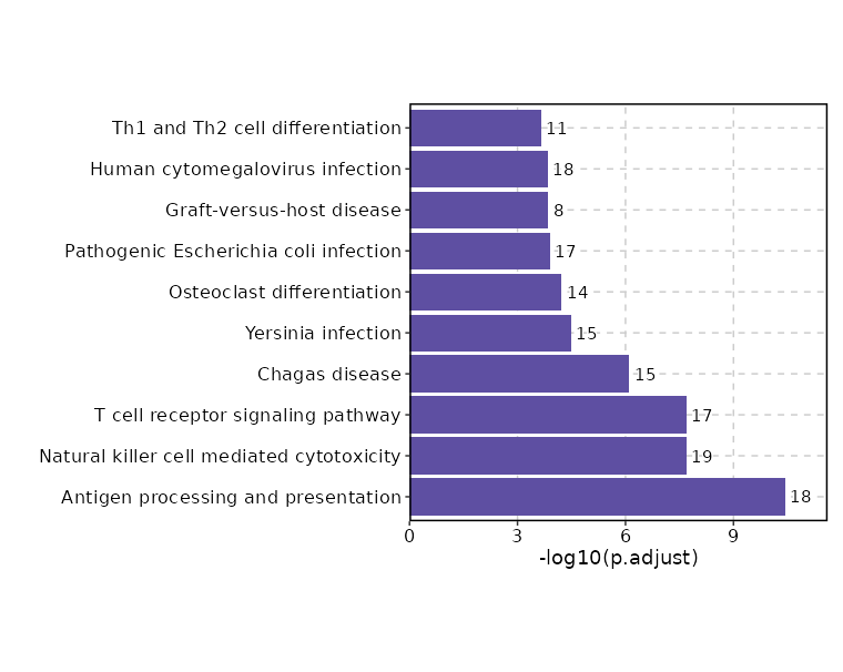 Enrichment Analysis Th1 and Th2 cell differentiation 31/92 1.396e-16 0 8.7144 318.14 NFATC3;NFATC2;RUNX3;NFKBIB;IFNG;HLA-DQB1;HLA-DRA;CD247;CD3G;IL2RG;CD3E;CD3D;TBX21;IL12RB1;HLA-DQA1;JAG1;HLA-DRB5;STAT1;LCK;ZAP70;IL2RB;HLA-DPB1;HLA-DRB1;GATA3;HLA-DMB;HLA-DPA1;MAPK1;JAK3;HLA-DMA;JAK1;JAK2 1 KEGG_2021_Human Graft-versus-host disease 21/42 8.627e-16 0 17.0289 590.6733 HLA-DRB5;GZMB;HLA-C;HLA-A;HLA-B;HLA-G;HLA-E;IFNG;HLA-DQB1;HLA-DRA;HLA-DPB1;KLRD1;HLA-DRB1;CD86;PRF1;FASLG;HLA-DMB;HLA-DPA1;KLRC1;HLA-DMA;HLA-DQA1 2 KEGG_2021_Human Th17 cell differentiation 32/107 0 0 7.3176 246.811 TGFB1;IL21R;IL2RG;TBX21;IL12RB1;HLA-DRB5;HLA-DRB1;GATA3;NFATC3;NFATC2;NFKBIB;IRF4;IFNG;HLA-DQB1;HLA-DRA;CD247;CD3G;CD3E;CD3D;HLA-DQA1;STAT1;LCK;ZAP70;IL2RB;HLA-DPB1;HLA-DMB;HLA-DPA1;MAPK1;JAK3;HLA-DMA;JAK1;JAK2 3 KEGG_2021_Human Antigen processing and presentation 27/78 0 0 9.05 296.4594 CD74;TAP2;TAP1;RFX5;IFNG;HLA-DQB1;HLA-DRA;KLRD1;CTSS;B2M;HLA-DQA1;HLA-DRB5;HLA-C;HLA-A;HLA-B;HLA-G;HLA-E;CD8B;CD8A;PSME2;HLA-DPB1;PSME1;HLA-DRB1;HLA-DMB;HLA-DPA1;KLRC1;HLA-DMA 4 KEGG_2021_Human Allograft rejection 19/38 0 0 17 535.7409 HLA-DRB5;GZMB;HLA-C;HLA-A;HLA-B;HLA-G;HLA-E;IFNG;HLA-DQB1;HLA-DRA;HLA-DPB1;HLA-DRB1;CD86;PRF1;FASLG;HLA-DMB;HLA-DPA1;HLA-DMA;HLA-DQA1 5 KEGG_2021_Human Pathways of neurodegeneration 71/475 0 0 3.0706 94.4336 ATG13;UQCRC2;OPTN;NRBF2;GABARAPL2;DAXX;GABARAPL1;PRKCB;ATG2A;GABARAP;ATXN1;COX6B1;PSMA4;PSMA5;PSMA1;NDUFA12;PSMB6;PSMB4;PSMB1;SQSTM1;MAP2K2;MAP2K3;UQCRB;FASLG;UQCRH;GPX7;TNFRSF1B;CDK5;NDUFB9;SLC25A4;NDUFB5;NDUFA2;SLC25A6;SLC25A5;BECN1;BAK1;UBE2L6;UBE2L3;FRAT2;XBP1;COX7A2L;CSNK2B;UBE2J2;ATP5F1D;UBE2G1;ATP5PD;COX5A;COX5B;ATP5F1A;ATP5F1B;ATP5F1C;ERN1;NDUFB10;COX6A1;CAPN2;SEM1;ATP5MC3;COX7A2;ATP5MC2;UBB;NDUFS8;NDUFS3;NDUFS2;CASP7;UQCRFS1;DNAI2;DDIT3;KRAS;DCTN3;RB1CC1;MAPK1 6 KEGG_2021_Human Epstein-Barr virus infection 42/202 0 0 4.5229 134.1177 RUNX3;B2M;HLA-DRB5;HLA-C;HLA-A;HLA-B;HLA-G;HLA-E;HLA-DRB1;HLA-DQB1;CD3G;CD3E;CD3D;HLA-DQA1;STAT1;HLA-DPB1;CD44;HLA-DMB;HLA-DPA1;JAK3;HLA-DMA;JAK1;TAP2;TAP1;RELB;BCL2L11;CCND3;MAP2K3;DDX58;ISG15;MYD88;SEM1;OAS1;NFKBIB;OAS2;HLA-DRA;IRF9;IRF7;CD247;TRADD;TNFAIP3;BAK1 7 KEGG_2021_Human Cell adhesion molecules 35/148 0 0 5.3159 153.7756 CD2;PDCD1;CD86;HLA-DRB5;HLA-C;HLA-A;HLA-B;HLA-G;HLA-E;CD8B;CD8A;SELL;HLA-DRB1;ICAM3;CD99;ITGA4;PTPRC;HLA-DQB1;HLA-DRA;PECAM1;GLG1;SPN;CTLA4;HLA-DQA1;HLA-DPB1;CD226;ITGB2;ITGB1;SELPLG;ITGAM;VSIR;HLA-DMB;HLA-DPA1;ITGB7;HLA-DMA 8 KEGG_2021_Human Leishmaniasis 25/77 0 0 8.2032 235.992 TGFB1;ITGA4;NFKBIB;IFNG;HLA-DQB1;HLA-DRA;FCGR3A;FCGR3B;HLA-DQA1;HLA-DRB5;STAT1;PRKCB;CYBA;MYD88;HLA-DPB1;HLA-DRB1;ITGB2;ITGB1;ITGAM;HLA-DMB;HLA-DPA1;MAPK1;HLA-DMA;JAK1;JAK2 9 KEGG_2021_Human Type I diabetes mellitus 19/43 0 0 13.4548 385.6727 HLA-DRB5;GZMB;HLA-C;HLA-A;HLA-B;HLA-G;HLA-E;IFNG;HLA-DQB1;HLA-DRA;HLA-DPB1;HLA-DRB1;CD86;PRF1;FASLG;HLA-DMB;HLA-DPA1;HLA-DMA;HLA-DQA1 10 KEGG_2021_Human Viral myocarditis 21/60 0 0 9.1607 238.7055 HLA-DQB1;HLA-DRA;CD86;HLA-DQA1;HLA-DRB5;HLA-C;HLA-A;HLA-B;HLA-G;HLA-E;HLA-DPB1;HLA-DRB1;ITGB2;ACTG1;PRF1;HLA-DMB;HLA-DPA1;FYN;RAC2;HLA-DMA;CD55 11 KEGG_2021_Human Parkinson disease 44/249 0 0 3.6961 92.8181 UQCRC2;UBE2L6;UBE2L3;DAXX;XBP1;COX7A2L;UBE2J2;ATP5F1D;UBE2G1;ATP5PD;COX6B1;PSMA4;PSMA5;PSMA1;COX5A;NDUFA12;COX5B;ATP5F1A;ATP5F1B;ATP5F1C;PSMB6;PSMB4;PSMB1;ERN1;NDUFB10;COX6A1;SEM1;UQCRB;ATP5MC3;COX7A2;ATP5MC2;UQCRH;UBB;NDUFS8;NDUFS3;NDUFS2;NDUFB9;SLC25A4;NDUFB5;UQCRFS1;NDUFA2;DDIT3;SLC25A6;SLC25A5 12 KEGG_2021_Human Influenza A 35/172 0 0 4.3791 106.5041 PYCARD;CCND3;MAP2K2;HLA-DRB5;DDX58;PRKCB;MYD88;HLA-DRB1;CALCOCO2;ACTG1;FASLG;TNFSF10;OAS1;NFKBIB;OAS2;IFNG;HLA-DQB1;HLA-DRA;IRF9;IRF7;SLC25A4;TRADD;HLA-DQA1;STAT1;HLA-DPB1;SLC25A6;SLC25A5;HLA-DMB;CCL5;HLA-DPA1;BAK1;MAPK1;HLA-DMA;JAK1;JAK2 13 KEGG_2021_Human Autoimmune thyroid disease 19/53 0 0 9.4924 229.7409 HLA-DQB1;HLA-DRA;CD86;CTLA4;HLA-DQA1;HLA-DRB5;GZMB;HLA-C;HLA-A;HLA-B;HLA-G;HLA-E;HLA-DPB1;HLA-DRB1;PRF1;FASLG;HLA-DMB;HLA-DPA1;HLA-DMA 14 KEGG_2021_Human Amyotrophic lateral sclerosis 54/364 0 0 3.0106 70.4567 ATG13;UQCRC2;PFN1;OPTN;NRBF2;GABARAPL2;DAXX;GABARAPL1;XBP1;COX7A2L;ATG2A;GABARAP;ATP5F1D;ATP5PD;COX6B1;PSMA4;PSMA5;PSMA1;COX5A;NDUFA12;COX5B;ATP5F1A;ATP5F1B;ATP5F1C;PSMB6;PSMB4;PSMB1;ERN1;SRSF3;SQSTM1;NDUFB10;COX6A1;MAP2K3;SEM1;UQCRB;ACTG1;ATP5MC3;COX7A2;ATP5MC2;UQCRH;GPX7;TNFRSF1B;NDUFS8;NDUFS3;NDUFS2;NDUFB9;NDUFB5;UQCRFS1;DNAI2;NDUFA2;DDIT3;BECN1;DCTN3;RB1CC1 15 KEGG_2021_Human Huntington disease 48/306 0 0 3.2065 73.4315 ATG13;UQCRC2;NRBF2;AP2S1;COX7A2L;ATG2A;ATP5F1D;CLTB;CLTA;ATP5PD;COX6B1;PSMA4;PSMA5;PSMA1;COX5A;NDUFA12;COX5B;ATP5F1A;ATP5F1B;ATP5F1C;PSMB6;PSMB4;PSMB1;ERN1;NDUFB10;COX6A1;SEM1;UQCRB;ATP5MC3;COX7A2;ATP5MC2;UQCRH;GPX7;NDUFS8;NDUFS3;NDUFS2;NDUFB9;SLC25A4;NDUFB5;UQCRFS1;DNAI2;NDUFA2;SLC25A6;SLC25A5;BECN1;DCTN3;RB1CC1;POLR2G 16 KEGG_2021_Human Human T-cell leukemia virus 1 infection 39/219 0 0 3.7189 84.2998 IL2RG;ADCY7;B2M;HLA-DRB5;HLA-C;HLA-A;HLA-B;HLA-G;HLA-E;HLA-DRB1;NFATC3;NFATC2;HLA-DQB1;CD3G;CD3E;CD3D;HLA-DQA1;HLA-DPB1;HLA-DMB;HLA-DPA1;TSPO;JAK3;HLA-DMA;JAK1;TGFB1;RELB;CCND3;MAP2K2;MAD1L1;ETS1;HLA-DRA;SLC25A4;LCK;IL2RB;KRAS;SLC25A6;SLC25A5;ITGB2;MAPK1 17 KEGG_2021_Human Natural killer cell mediated cytotoxicity 29/131 0 0 4.8558 109.3705 KLRD1;SH3BP2;MAP2K2;SH2D1A;HLA-C;HLA-A;PRKCB;HLA-B;HLA-G;HLA-E;PRF1;FASLG;KLRK1;KLRC1;TNFSF10;NFATC2;IFNG;HCST;CD247;FCGR3A;FCGR3B;GZMB;LCK;ZAP70;KRAS;ITGB2;MAPK1;FYN;RAC2 18 KEGG_2021_Human Human immunodeficiency virus 1 infection 38/212 0 0 3.7463 83.6229 RNF7;GNG2;GNG5;B2M;APOBEC3F;APOBEC3G;APOBEC3H;HLA-C;HLA-A;PRKCB;HLA-B;HLA-G;HLA-E;APOBEC3C;NFATC3;NFATC2;BST2;CD3G;CD3E;CD3D;CCR5;ELOB;RAC2;TAP2;TAP1;CFL1;MAP2K2;MAP2K3;MYD88;GNB2;PXN;FASLG;TNFRSF1B;CD247;TRADD;KRAS;BAK1;MAPK1 19 KEGG_2021_Human Diabetic cardiomyopathy 37/203 0 0 3.8216 85.0975 UQCRC2;PRKCB;COX7A2L;PDK2;ATP5F1D;CTSD;ATP5PD;COX6B1;COX5A;NDUFA12;COX5B;ATP5F1A;ATP5F1B;ATP5F1C;RAC2;TGFB1;PPP1CA;NDUFB10;COX6A1;CYBA;UQCRB;ATP5MC3;COX7A2;ATP5MC2;UQCRH;GFPT2;NDUFS8;NDUFS3;NDUFS2;NDUFB9;SLC25A4;NDUFB5;UQCRFS1;NDUFA2;SLC25A6;SLC25A5;GAPDH 20 KE