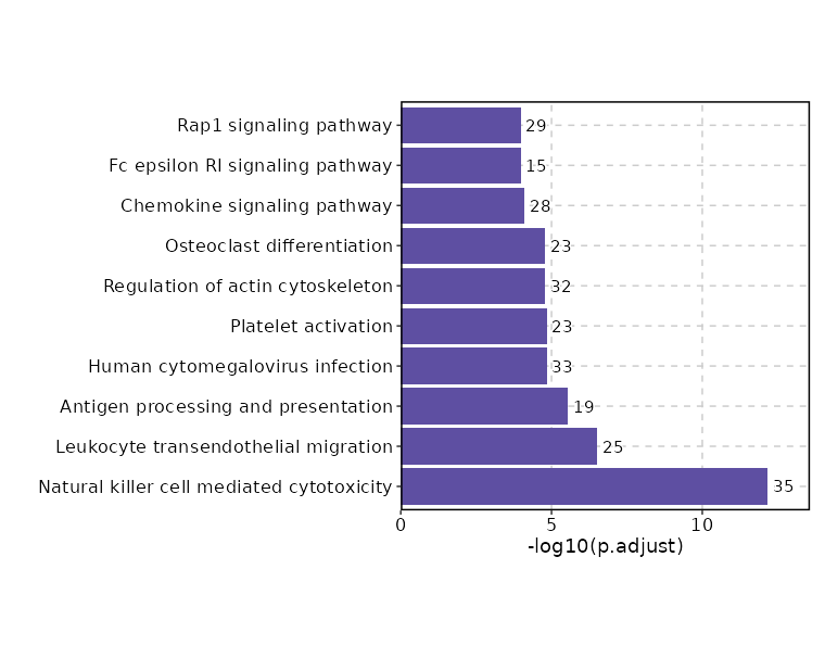 Enrichment Analysis Natural killer cell mediated cytotoxicity 35/131 0 0 6.45 217.4106 KLRC3;TYROBP;KLRD1;PTPN6;SH2D1B;PRKCA;PIK3R1;PRF1;FASLG;ICAM1;KLRK1;KLRC2;PLCG2;VAV3;NCR2;NCR3;NCR1;HCST;LCP2;CD247;CD244;SOS1;PIK3R3;KIR2DL3;KLRC4-KLRK1;PPP3CA;FCER1G;KIR3DL1;KIR3DL2;KIR3DL3;LCK;PIK3CD;PTK2B;MAPK1;FYN 1 KEGG_2021_Human Leukocyte transendothelial migration 25/114 0 0 4.925 98.3483 ACTN4;MAPK12;ROCK1;MYL12B;CYBA;PRKCA;VASP;PIK3R1;TXK;ICAM1;PLCG2;CD99;MSN;RHOH;VAV3;PECAM1;PIK3R3;CDC42;CLDN7;SIPA1;ITGB1;CTNNB1;PIK3CD;PTK2B;CTNNA1 2 KEGG_2021_Human Antigen processing and presentation 19/78 0 0 5.6238 97.5195 HSP90AA1;HSPA6;KLRC3;HSPA5;KLRC4;HSPA4;HSPA1A;KLRD1;CALR;HSPA1B;KIR2DL3;KIR2DL4;PDIA3;KIR3DL1;KIR3DL2;KIR3DL3;CANX;HSP90AB1;KLRC2 3 KEGG_2021_Human Human cytomegalovirus infection 33/225 0 0 3.0195 45.9591 MAPK12;BAX;ADCY9;GNG2;CREB3L2;PRKCA;PIK3R1;PRKACB;CALR;GNGT2;PPP3CA;PTGER1;PTGER2;CTNNB1;AKAP13;JAK1;ROCK1;PDIA3;GNB5;GNAS;CCL4L2;FASLG;MAP2K6;TNFRSF1A;SOS1;CCL3L1;PIK3R3;SRC;PIK3CD;CCL5;CCL4;PTK2B;MAPK1 4 KEGG_2021_Human Platelet activation 23/124 0 0 3.9827 60.6092 PPP1CA;MAPK12;TLN1;ROCK1;ADCY9;MYL12B;VASP;PIK3R1;GNAS;PLCG2;PRKACB;LYN;PPP1R12A;APBB1IP;LCP2;PIK3R3;PIK3R6;FCER1G;ITGB1;SRC;PIK3CD;MAPK1;FYN 5 KEGG_2021_Human Regulation of actin cytoskeleton 32/218 0 0 3.0206 44.7784 ACTN4;CYFIP2;MYL12B;PIK3R1;PDGFD;VAV3;ARHGEF7;IQGAP1;TMSB4X;PDGFRB;PPP1CA;ROCK1;SSH3;SSH1;ARPC2;ITGA1;ACTR3;PPP1R12A;LIMK1;MSN;BAIAP2;ITGAE;MYH9;SOS1;PIK3R3;WASF1;CDC42;ITGB1;SRC;PIK3CD;MAPK1;ITGB7 6 KEGG_2021_Human Osteoclast differentiation 23/127 0 0 3.8672 57.1227 TYROBP;MAPK12;SQSTM1;CYBA;FOSL2;PIK3R1;SIRPG;PLCG2;MAP2K6;LILRB1;TGFBR1;TNFRSF1A;CAMK4;LCP2;PIK3R3;PPP3CA;SOCS1;ACP5;LCK;PIK3CD;MAPK1;FYN;JAK1 7 KEGG_2021_Human Chemokine signaling pathway 28/192 0 0.0001 2.9899 38.9522 ROCK1;ADCY9;GNG2;PREX1;PIK3R1;GNB5;CCL4L2;PLCG2;PRKACB;LYN;XCL1;VAV3;XCL2;SOS1;CCL3L1;PIK3R3;PIK3R6;GNGT2;GRK5;CCR9;CDC42;SRC;PIK3CD;ARRB1;CCL5;CCL4;PTK2B;MAPK1 8 KEGG_2021_Human Fc epsilon RI signaling pathway 15/68 0 0.0001 4.9258 62.3018 LYN;VAV3;MAPK12;LCP2;SOS1;PIK3R3;FCER1G;ALOX5AP;PRKCA;PIK3R1;PIK3CD;MAPK1;FYN;PLCG2;MAP2K6 9 KEGG_2021_Human Rap1 signaling pathway 29/210 0 0.0001 2.8059 34.5886 MAPK12;SKAP1;TLN1;ADCY9;PRKCA;VASP;PIK3R1;PRKD3;PDGFD;VAV3;APBB1IP;RAPGEF5;SIPA1;CTNNB1;SIPA1L1;PDGFRB;GNAS;MAP2K6;ARAP3;LCP2;PIK3R3;RALGDS;CDC42;EVL;ITGB1;SRC;PIK3CD;THBS1;MAPK1 10 KEGG_2021_Human Pathways in cancer 55/531 0 0.0001 2.0413 25.0704 BAX;ADCY9;DLL1;GNG2;JAG2;PRKCA;HMOX1;PLCG2;PRKACB;GSTM4;CDKN2B;STAT4;CKS2;GSTP1;APPL1;JAK1;TPM3;ZBTB16;MSH3;ROCK1;HSP90B1;IL12RB2;FASLG;PIM1;HSP90AA1;SOS1;RALGDS;CDC42;IL2RB;ITGB1;HSP90AB1;PIK3CD;EPAS1;GADD45B;PIK3R1;MGST2;RASSF1;IL15;GNGT2;PTGER1;PTGER2;CTNNB1;CTNNA1;PDGFRB;IL4R;RXRA;CCND2;GNB5;GNAS;TGFBR1;PIK3R3;DAPK2;DAPK3;CBL;MAPK1 11 KEGG_2021_Human Fc gamma R-mediated phagocytosis 18/97 0 0.0001 3.9711 48.5936 PRKCA;VASP;PIK3R1;BIN1;ARPC2;PLPP2;PLPP1;PLCG2;ACTR3;LYN;LIMK1;VAV3;PIK3R3;WASF1;CDC42;ARF6;PIK3CD;MAPK1 12 KEGG_2021_Human Shigellosis 32/246 0 0.0001 2.6215 31.8595 ACTN4;MAPK12;BAX;TLN1;MYL12B;GABARAPL1;PIK3R1;C3;PLCG2;RIPK2;HCLS1;ARF6;SQSTM1;PPID;ROCK1;ARPC2;UBC;UBB;ACTR3;WIPI1;TNFRSF1A;ILK;PIK3R3;WASF1;CDC42;VDAC1;ITGB1;SRC;PIK3CD;CYTH4;CCL5;MAPK1 13 KEGG_2021_Human Focal adhesion 28/201 0 0.0001 2.833 34.3426 ACTN4;TLN1;MYL12B;PRKCA;VASP;PIK3R1;PDGFD;VAV3;CTNNB1;PDGFRB;PPP1CA;ZYX;ROCK1;CCND2;ITGA1;PPP1R12A;PARVB;SOS1;ILK;PIK3R3;CDC42;ITGB1;SRC;PIK3CD;THBS1;MAPK1;FYN;ITGB7 14 KEGG_2021_Human Yersinia infection 22/137 0 0.0001 3.3402 40.4793 MAPK12;SKAP2;ROCK1;PIK3R1;ARPC2;MAP2K6;ACTR3;LIMK1;BAIAP2;VAV3;LCP2;ARHGEF7;PIK3R3;CDC42;LCK;ARF6;ITGB1;SRC;PIK3CD;RPS6KA1;PTK2B;MAPK1 15 KEGG_2021_Human Pathogenic Escherichia coli infection 27/197 0 0.0002 2.7779 31.7739 MAPK12;BAX;CYFIP2;MYO6;TUBB4A;HCLS1;ARF6;PTPN6;ROCK1;SLC9A3R1;ARPC2;NCL;FASLG;ACTR3;BAIAP2;TNFRSF1A;MYH9;WASF1;CDC42;CLDN7;MYO1E;GAPDH;ITGB1;SRC;CYTH4;MAPK1;FYN 16 KEGG_2021_Human Bacterial invasion of epithelial cells 15/77 0 0.0003 4.2087 46.4576 ACTR3;MAD2L2;ILK;PIK3R3;WASF1;CDC42;PIK3R1;ARPC2;HCLS1;ITGB1;SRC;CTNNB1;PIK3CD;CBL;CTNNA1 17 KEGG_2021_Human Phospholipase D signaling pathway 22/148 0 0.0003 3.0468 33.0749 PDGFRB;DGKD;ADCY9;PRKCA;PIK3R1;GNAS;PLPP2;PLPP1;PDGFD;PLCG2;SOS1;PIK3R3;AGPAT2;PIK3R6;FCER1G;RALGDS;ARF6;PIK3CD;CYTH4;PTK2B;MAPK1;FYN 18 KEGG_2021_Human Lipid and atherosclerosis 28/215 0 0.0003 2.6189 28.389 MAPK12;HSPA1A;BAX;HSPA1B;PRKCA;PIK3R1;ICAM1;LYN;VAV3;PPP3CA;HSP90B1;RXRA;CYBA;FASLG;MAP2K6;HSP90AA1;HSPA6;HSPA5;HSPA4;TNFRSF1A;CCL3L1;PIK3R3;CDC42;SRC;HSP90AB1;PIK3CD;CCL5;MAPK1 19 KEGG_2021_Human Kaposi sarcoma-associated herpesvirus infection 26/193 0 0.0003 2.7209 29.283 MAPK12;BAX;GNG2;PREX1;GABARAPL1;PIK3R1;ICAM1;C3;PLCG2;LYN;GNGT2;PPP3CA;CTNNB1;JAK1;ZFP36;GNB5;UBC;UBB;MAP2K6;TNFRSF1A;PIK3R3;PIK3R6;CLEC2B;SRC;PIK3CD;MAPK1 20 KEGG_2021_Human