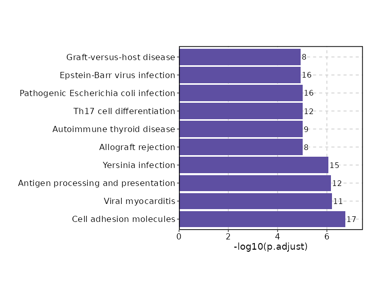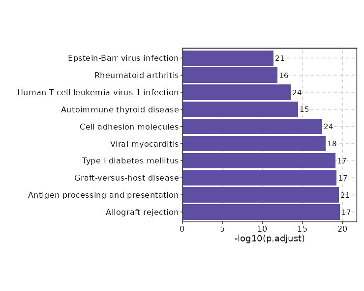 Enrichment Analysis Allograft rejection 17/38 1.008e-22 2.077e-20 66.2432 3355.122 HLA-DRB5;HLA-C;HLA-A;HLA-B;HLA-E;HLA-F;IFNG;HLA-DQB1;HLA-DRA;HLA-DPB1;HLA-DRB1;PRF1;TNF;HLA-DPA1;HLA-DMA;HLA-DOA;HLA-DQA1 1 KEGG_2021_Human Antigen processing and presentation 21/78 2.627e-22 2.706e-20 30.6007 1520.576 CD74;IFNG;HLA-DQB1;HLA-DRA;TNF;B2M;HLA-DOA;HLA-DQA1;HLA-DRB5;HLA-C;HLA-A;HLA-B;HLA-E;HLA-F;CD8B;CD8A;HLA-DPB1;PSME1;HLA-DRB1;HLA-DPA1;HLA-DMA 2 KEGG_2021_Human Graft-versus-host disease 17/42 8.523e-22 5.852e-20 55.633 2698.9887 HLA-DRB5;HLA-C;HLA-A;HLA-B;HLA-E;HLA-F;IFNG;HLA-DQB1;HLA-DRA;HLA-DPB1;HLA-DRB1;PRF1;TNF;HLA-DPA1;HLA-DMA;HLA-DOA;HLA-DQA1 3 KEGG_2021_Human Type I diabetes mellitus 17/43 1.393e-21 7.176e-20 53.4906 2568.7515 HLA-DRB5;HLA-C;HLA-A;HLA-B;HLA-E;HLA-F;IFNG;HLA-DQB1;HLA-DRA;HLA-DPB1;HLA-DRB1;PRF1;TNF;HLA-DPA1;HLA-DMA;HLA-DOA;HLA-DQA1 4 KEGG_2021_Human Viral myocarditis 18/60 3.074e-20 1.267e-18 35.1786 1580.5276 HLA-DQB1;HLA-DRA;HLA-DOA;HLA-DQA1;HLA-DRB5;HLA-C;HLA-A;HLA-B;HLA-E;HLA-F;HLA-DPB1;HLA-DRB1;ITGB2;PRF1;ITGAL;HLA-DPA1;FYN;HLA-DMA 5 KEGG_2021_Human Cell adhesion molecules 24/148 1.018e-19 3.495e-18 16.2266 709.6138 VCAM1;PDCD1;HLA-DOA;HLA-DRB5;HLA-C;HLA-A;HLA-B;HLA-E;HLA-F;CD8B;CD8A;HLA-DRB1;CD99;PTPRC;HLA-DQB1;HLA-DRA;PECAM1;HLA-DQA1;HLA-DPB1;ITGB2;ITGAL;HLA-DPA1;HLA-DMA;TIGIT 6 KEGG_2021_Human Autoimmune thyroid disease 15/53 1.224e-16 0 32.0078 1172.7496 HLA-DQB1;HLA-DRA;HLA-DOA;HLA-DQA1;HLA-DRB5;HLA-C;HLA-A;HLA-B;HLA-E;HLA-F;HLA-DPB1;HLA-DRB1;PRF1;HLA-DPA1;HLA-DMA 7 KEGG_2021_Human Human T-cell leukemia virus 1 infection 24/219 0 0 10.2811 354.3815 E2F3;B2M;HLA-DRB5;HLA-C;HLA-A;HLA-B;HLA-E;HLA-F;PIK3R1;HLA-DRB1;NFATC2;HLA-DQB1;PPP3CC;HLA-DQA1;HLA-DPB1;HLA-DPA1;HLA-DMA;TNF;CCND3;HLA-DOA;MAD1L1;HLA-DRA;ITGB2;ITGAL 8 KEGG_2021_Human Rheumatoid arthritis 16/93 0 0 16.8853 514.6445 IFNG;HLA-DQB1;HLA-DRA;CCL3L1;TNF;HLA-DOA;HLA-DQA1;HLA-DRB5;HLA-DPB1;HLA-DRB1;ITGB2;ITGAL;CCL5;HLA-DPA1;CCL3;HLA-DMA 9 KEGG_2021_Human Epstein-Barr virus infection 21/202 0 0 9.576 279.9597 E2F3;B2M;HLA-DRB5;HLA-C;HLA-A;HLA-B;HLA-E;HLA-F;PIK3R1;HLA-DRB1;HLA-DQB1;HLA-DQA1;HLA-DPB1;CD44;HLA-DPA1;HLA-DMA;TNF;CCND3;HLA-DOA;HLA-DRA;ITGAL 10 KEGG_2021_Human Leishmaniasis 14/77 0 0 17.9226 495.0095 IFNG;HLA-DQB1;HLA-DRA;TNF;HLA-DOA;HLA-DQA1;HLA-DRB5;PRKCB;CYBA;HLA-DPB1;HLA-DRB1;ITGB2;HLA-DPA1;HLA-DMA 11 KEGG_2021_Human Asthma 10/31 0 0 37.8667 996.2751 HLA-DRB5;HLA-DQB1;HLA-DRA;HLA-DPB1;HLA-DRB1;TNF;HLA-DPA1;HLA-DMA;HLA-DOA;HLA-DQA1 12 KEGG_2021_Human Phagosome 17/152 0 0 10.2449 256.8049 TUBA4A;HLA-DOA;HLA-DRB5;HLA-C;HLA-A;CYBA;HLA-B;HLA-E;HLA-F;HLA-DRB1;HLA-DQB1;HLA-DRA;HLA-DQA1;HLA-DPB1;ITGB2;HLA-DPA1;HLA-DMA 13 KEGG_2021_Human Natural killer cell mediated cytotoxicity 16/131 0 0 11.2839 282.3122 TNF;SH2D1A;HLA-C;HLA-A;PRKCB;HLA-B;HLA-E;PIK3R1;PRF1;NFATC2;IFNG;HCST;PPP3CC;ITGB2;ITGAL;FYN 14 KEGG_2021_Human Human cytomegalovirus infection 20/225 0 0 8.0086 200.0871 GNG2;E2F3;B2M;HLA-C;HLA-A;PRKCB;HLA-B;HLA-E;HLA-F;PIK3R1;IL10RA;NFATC2;PPP3CC;CXCR4;TNF;CCL4L2;CCL3L1;CCL5;CCL4;CCL3 15 KEGG_2021_Human Hematopoietic cell lineage 14/99 0 0 13.2689 319.2419 TNF;HLA-DOA;HLA-DRB5;CD8B;CD8A;HLA-DRB1;HLA-DQB1;HLA-DRA;MS4A1;HLA-DQA1;HLA-DPB1;CD44;HLA-DPA1;HLA-DMA 16 KEGG_2021_Human Intestinal immune network for IgA production 10/48 0 0 20.9083 449.7153 HLA-DRB5;HLA-DQB1;HLA-DRA;HLA-DPB1;HLA-DRB1;CXCR4;HLA-DPA1;HLA-DMA;HLA-DOA;HLA-DQA1 17 KEGG_2021_Human Inflammatory bowel disease 11/65 0 0 16.2369 343.6312 IFNG;HLA-DQB1;HLA-DRA;TNF;HLA-DOA;HLA-DQA1;HLA-DRB5;HLA-DPB1;HLA-DRB1;HLA-DPA1;HLA-DMA 18 KEGG_2021_Human Influenza A 16/172 0 0 8.3009 173.4687 TNF;CCND3;HLA-DOA;HLA-DRB5;PRKCB;PIK3R1;HLA-DRB1;IFNG;HLA-DQB1;HLA-DRA;DNAJB1;HLA-DQA1;HLA-DPB1;CCL5;HLA-DPA1;HLA-DMA 19 KEGG_2021_Human Th1 and Th2 cell differentiation 12/92 0 0 11.989 237.9934 NFATC2;IFNG;HLA-DQB1;HLA-DRA;PPP3CC;HLA-DOA;HLA-DQA1;HLA-DRB5;HLA-DPB1;HLA-DRB1;HLA-DPA1;HLA-DMA 20 KEGG_2021_Human