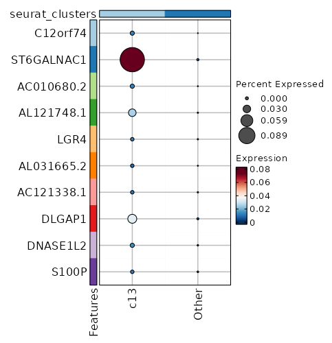 seurat_clusters: c13 Markers Showing top 100 markers ordered by p_val_adj ascendingly, then abs(avg_log2FC) descendingly. Use 'Download the entire data' button to download all significant markers by 'p_val_adj < 0.05 & avg_log2FC > 0'.