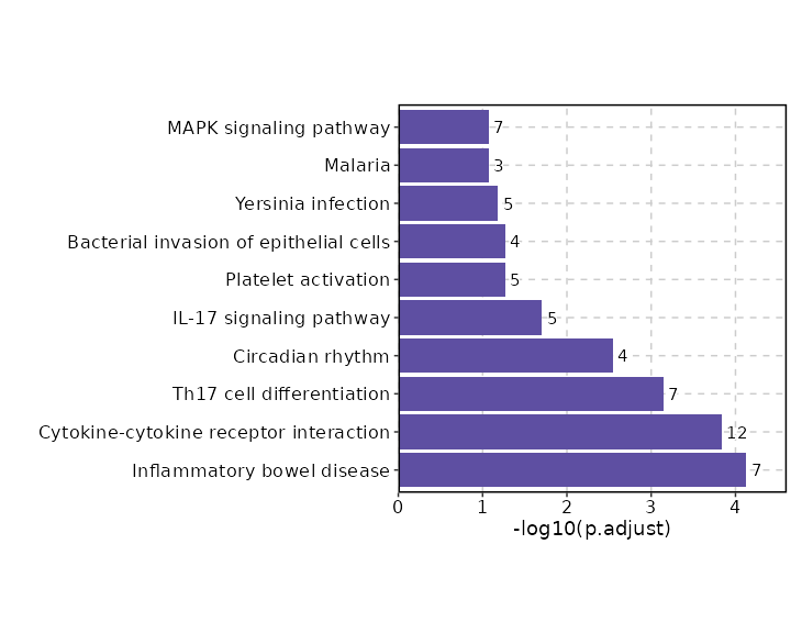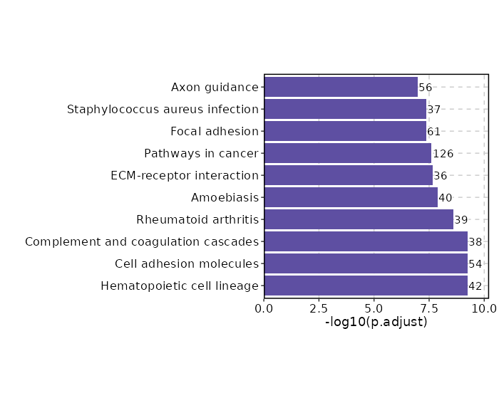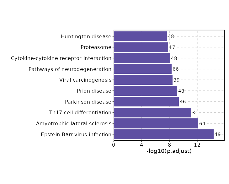 The bar plot shows the top enriched terms in database 'KEGG_2021_Human', the x-axis shows the -log10 of the adjusted p-values, and the y-axis shows the term names. The number next to each bar indicates the overlap gene count.