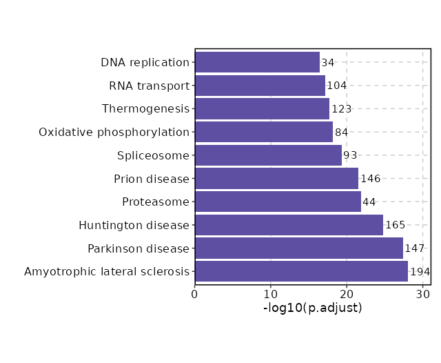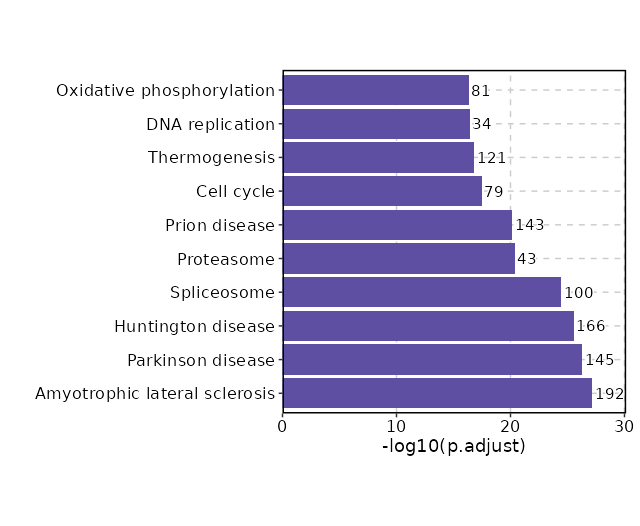 Enrichment Analysis Amyotrophic lateral sclerosis 194/364 2.64e-31 8.395e-29 3.5146 247.4592 BAD;NUP210;ATG13;MAPK11;MAPK12;NUP93;PSMC6;PSMC4;PSMC5;PSMC2;PSMC3;UQCRC2;BAX;PSMC1;UQCRC1;PFN1;TP53;NUP205;UQCR10;PSMD9;ACTB;PSMD7;PSMD8;PSMD6;NUP85;PSMD3;PSMD4;PSMD1;PSMD2;SIGMAR1;COX8A;DAXX;RAB39B;POM121;WDR41;GLE1;NUP62;SEC13;NDC1;TUBB;ATP5F1D;ATP5F1E;COX6C;TOMM40L;COX7B;ACTR1A;ATG101;ATP5PF;ATP5PD;ATP5PB;TUBB4B;COX6B1;PSMA6;PSMA7;PSMA4;PSMA5;HNRNPA2B1;PSMA2;PSMA3;NDUFAB1;PSMA1;ATP5PO;COX5A;TOMM40;NDUFA12;NDUFA13;NDUFA10;NDUFA11;NUP188;COX5B;PSMA8;PSMB7;ATP5F1A;ATP5F1B;PSMB5;TUBA1C;ATP5F1C;PSMB6;TUBA1B;PSMB3;PSMB4;PSMB1;PSMB2;RAB8A;RAC1;NEFH;BID;ALYREF;SDHD;SDHB;SDHC;SDHA;TUBA8;UQCRQ;SRSF3;SRSF7;NDUFB11;NDUFB10;NUP160;COX6A1;TUBB6;KIF5C;TUBB3;RAE1;NDUFV2;NDUFV1;MAP2K3;CHCHD10;NUP153;NUP155;TRAF2;EIF2S1;SEM1;DNAL1;DNAL4;VCP;ACTG1;ATP5MC3;COX7A2;ATP5MC1;ATP5MC2;UQCRH;CYC1;APAF1;GPX7;NCBP1;EIF2AK3;WIPI1;NDUFC2;WIPI2;NDUFC1;NUP50;NDUFS8;NDUFS7;NUP54;NDUFS6;NDUFS5;NDUFS4;NDUFS3;NUP58;CYCS;NDUFS2;NDUFS1;MCU;PSMD11;NDUFB9;PSMD13;SEH1L;NDUFB8;PSMD12;NDUFB7;NDUFB6;PSMD14;NDUFB5;NDUFB4;NDUFB3;ITPR3;NDUFB2;PIK3R4;NDUFB1;KLC2;CASP9;NUP43;UQCRFS1;CASP3;DNAI2;NDUFA9;NDUFA8;NDUFA7;NDUFA6;NDUFA5;ADRM1;NDUFA4;NDUFA3;NDUFA2;NDUFA1;SOD1;UQCRHL;VAPB;ALS2;NUP35;MATR3;VDAC1;NUP37;BECN1;DCTN6;NUP107;NXT1;NXT2;DCTN3;DCTN2;DCTN5;HNRNPA3;HNRNPA1 1 KEGG_2021_Human Parkinson disease 147/249 2.554e-30 4.061e-28 4.4158 300.8891 TRAP1;PSMC6;PSMC4;PSMC5;PSMC2;PSMC3;UQCRC2;BAX;PSMC1;UQCRC1;CALM3;TP53;CALM1;UQCR10;UBE2L6;UBE2L3;PSMD9;PSMD7;PSMD8;PSMD6;PSMD3;PSMD4;PSMD1;PSMD2;COX8A;DAXX;TXN;UBE2J2;PRKACA;TUBB;ATP5F1D;ATP5F1E;COX6C;UBE2G1;COX7B;UCHL1;ATP5PF;ATP5PD;ATP5PB;TUBB4B;COX6B1;PSMA6;PSMA7;PSMA4;PSMA5;PSMA2;PSMA3;NDUFAB1;PSMA1;ATP5PO;COX5A;NDUFA12;NDUFA13;NDUFA10;NDUFA11;COX5B;GNAI2;PSMA8;GNAI3;PSMB7;ATP5F1A;ATP5F1B;PSMB5;TUBA1C;ATP5F1C;PSMB6;TUBA1B;PSMB3;PSMB4;PSMB1;PSMB2;SDHD;SDHB;SDHC;SDHA;TUBA8;UQCRQ;PPIF;NDUFB11;NDUFB10;PARK7;COX6A1;TUBB6;KIF5C;TUBB3;NDUFV2;NDUFV1;EIF2S1;SEM1;UBA1;TXN2;ATP5MC3;HTRA2;COX7A2;ATP5MC1;ATP5MC2;UQCRH;CYC1;APAF1;EIF2AK3;NDUFC2;NDUFC1;NDUFS8;NDUFS7;NDUFS6;NDUFS5;NDUFS4;NDUFS3;CYCS;NDUFS2;NDUFS1;MCU;PSMD11;NDUFB9;PSMD13;SLC25A4;NDUFB8;PSMD12;NDUFB7;NDUFB6;PSMD14;NDUFB5;NDUFB4;NDUFB3;ITPR3;NDUFB2;NDUFB1;KLC2;CASP9;UQCRFS1;CASP3;NDUFA9;NDUFA8;NDUFA7;NDUFA6;NDUFA5;ADRM1;NDUFA4;NDUFA3;NDUFA2;NDUFA1;UQCRHL;VDAC3;VDAC2;VDAC1;SLC25A5;MAPK9 2 KEGG_2021_Human Huntington disease 165/306 1.467e-27 1.555e-25 3.5894 221.7774 ATG13;PSMC6;PSMC4;PSMC5;PSMC2;PSMC3;UQCRC2;BAX;PSMC1;UQCRC1;TFAM;TP53;UQCR10;PSMD9;PSMD7;PSMD8;CREB3L4;PSMD6;PSMD3;PSMD4;PSMD1;AP2S1;PSMD2;COX8A;TUBB;ATP5F1D;ATP5F1E;COX6C;COX7B;CLTC;CLTB;CLTA;ACTR1A;ATG101;ATP5PF;ATP5PD;ATP5PB;TUBB4B;COX6B1;PSMA6;PSMA7;PSMA4;PSMA5;PSMA2;PSMA3;NDUFAB1;PSMA1;ATP5PO;COX5A;NDUFA12;NDUFA13;NDUFA10;NDUFA11;AP2A1;COX5B;PSMA8;PSMB7;ATP5F1A;ATP5F1B;PSMB5;TUBA1C;ATP5F1C;PSMB6;TUBA1B;PSMB3;PSMB4;PSMB1;PSMB2;SDHD;SDHB;SDHC;SDHA;TUBA8;UQCRQ;PPIF;NDUFB11;NDUFB10;COX6A1;TUBB6;KIF5C;TUBB3;NDUFV2;NDUFV1;TRAF2;CREB3;SEM1;DNAL1;DNAL4;ATP5MC3;COX7A2;ATP5MC1;ATP5MC2;UQCRH;CYC1;AP2M1;APAF1;GPX7;WIPI1;NDUFC2;WIPI2;NDUFC1;NDUFS8;NDUFS7;NDUFS6;NDUFS5;NDUFS4;NDUFS3;CYCS;NDUFS2;NDUFS1;PSMD11;NDUFB9;PSMD13;SLC25A4;NDUFB8;PSMD12;NDUFB7;NDUFB6;PSMD14;NDUFB5;NDUFB4;NDUFB3;NDUFB2;PIK3R4;NDUFB1;KLC2;CASP9;UQCRFS1;CASP3;DNAI2;TBP;NDUFA9;NDUFA8;NDUFA7;NDUFA6;NDUFA5;ADRM1;NDUFA4;NDUFA3;NDUFA2;NDUFA1;SOD1;UQCRHL;VDAC3;VDAC2;VDAC1;SLC25A5;BECN1;DCTN6;DCTN3;HDAC1;DCTN2;HDAC2;DCTN5;MAPK9;POLR2C;POLR2D;POLR2E;POLR2F;POLR2G;POLR2H;POLR2I;POLR2J;POLR2K;POLR2L 3 KEGG_2021_Human Proteasome 44/46 1.767e-24 1.405e-22 66.4521 3634.4399 ADRM1;PSMB9;PSMA6;PSMA7;PSMA4;PSMC6;PSMA5;SEM1;PSMA2;PSMC4;PSMA3;PSMC5;PSMC2;PSME4;IFNG;PSMA1;PSMC3;PSME2;PSMC1;PSME3;PSME1;PSMD11;PSMD13;PSMD12;POMP;PSMD14;PSMA8;PSMB10;PSMB7;PSMD9;PSMB8;PSMB5;PSMD7;PSMB6;PSMD8;PSMB3;PSMB4;PSMD6;PSMB1;PSMD3;PSMB2;PSMD4;PSMD1;PSMD2 4 KEGG_2021_Human Prion disease 146/273 4.644e-24 2.953e-22 3.5157 188.889 BAD;MAPK11;MAPK12;PSMC6;PSMC4;PSMC5;PSMC2;PSMC3;UQCRC2;BAX;PSMC1;UQCRC1;UQCR10;PSMD9;PSMD7;PSMD8;CREB3L4;PSMD6;PSMD3;PSMD4;PSMD1;PSMD2;COX8A;CSNK2B;PRKACA;TUBB;ATP5F1D;ATP5F1E;COX6C;COX7B;STIP1;ATP5PF;ATP5PD;CSNK2A2;CSNK2A1;ATP5PB;TUBB4B;COX6B1;PSMA6;PSMA7;PSMA4;PSMA5;PSMA2;PSMA3;NDUFAB1;PSMA1;ATP5PO;COX5A;NDUFA12;NDUFA13;NDUFA10;NDUFA11;COX5B;PSMA8;PSMB7;ATP5F1A;ATP5F1B;PSMB5;TUBA1C;ATP5F1C;PSMB6;TUBA1B;PSMB3;PSMB4;PSMB1;PSMB2;RAC1;RAC2;SDHD;SDHB;SDHC;SDHA;TUBA8;UQCRQ;PPIF;NDUFB11;NDUFB10;COX6A1;TUBB6;KIF5C;TUBB3;NDUFV2;NDUFV1;EIF2S1;CREB3;SEM1;NCF2;ATP5MC3;COX7A2;ATP5MC1;ATP5MC2;UQCRH;CYC1;APAF1;HSPA8;EIF2AK3;NDUFC2;NDUFC1;NDUFS8;NDUFS7;NDUFS6;NDUFS5;NDUFS4;NDUFS3;CYCS;NDUFS2;NDUFS1;MCU;PSMD11;NDUFB9;PSMD13;SLC25A4;NDUFB8;PSMD12;NDUFB7;NDUFB6;PSMD14;NDUFB5;NDUFB4;NDUFB3;ITPR3;NDUFB2;NDUFB1;KLC2;CASP9;UQCRFS1;CASP3;NDUFA9;NDUFA8;NDUFA7;NDUFA6;NDUFA5;ADRM1;NDUFA4;NDUFA3;NDUFA2;NDUFA1;SOD1;UQCRHL;VDAC3;VDAC2;VDAC1;SLC25A5;MAPK9;MAPK3;MAPK1 5 KEGG_2021_Human Spliceosome 93/150 8.655e-22 4.587e-20 4.9592 240.5125 PPIL1;ALYREF;CWC15;CHERP;WBP11;HNRNPM;PHF5A;SNRPA;HNRNPK;SRSF3;SRSF4;HNRNPC;SNRNP27;SNRPF;PPIH;SNRPG;SRSF6;SRSF7;SNRPE;PPIE;SNRPB;SRSF9;SNRPC;SF3B5;SF3B6;SF3B3;SF3B4;SRSF1;SRSF2;HNRNPU;EFTUD2;MAGOH;SNRPD3;SNRPD2;SNRPD1;DHX38;SF3B2;TXNL4A;PRPF38A;BUD31;LSM2;LSM6;LSM5;LSM4;LSM3;LSM8;SNW1;LSM7;PRPF4;TCERG1;PCBP1;ZMAT2;SNRNP70;DHX15;CCDC12;RBM17;NCBP2;HSPA8;NCBP1;CDC5L;PRPF40A;MAGOHB;PRPF19;USP39;DDX46;RBM8A;DDX42;SNU13;U2AF1L5;PLRG1;CTNNBL1;SF3A2;SF3A3;THOC1;THOC3;U2SURP;SNRNP40;PRPF31;RP9;SNRPA1;EIF4A3;ISY1;DDX23;U2AF2;U2AF1;SART1;PUF60;TRA2B;SNRPB2;SRSF10;HNRNPA3;SMNDC1;HNRNPA1 6 KEGG_2021_Human Oxidative phosphorylation 84/133 1.437e-20 6.529e-19 5.2038 237.7558 PPA1;SDHD;SDHB;SDHC;SDHA;PPA2;UQCRQ;UQCRC2;UQCRC1;ATP6V0D1;NDUFB11;NDUFB10;UQCR10;COX6A1;NDUFV2;NDUFV1;COX8A;ATP6V0B;ATP6V1B2;ATP6V1D;COX17;ATP5MC3;COX7A2;ATP5MC1;ATP5MC2;UQCRH;COX15;ATP6V1F;CYC1;ATP6V1C1;ATP6V0A2;COX10;NDUFC2;NDUFC1;ATP5F1D;ATP5F1E;COX6C;NDUFS8;NDUFS7;NDUFS6;NDUFS5;NDUFS4;NDUFS3;NDUFS2;NDUFS1;ATP5ME;NDUFB9;COX7B;NDUFB8;NDUFB7;NDUFB6;NDUFB5;NDUFB4;ND