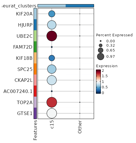 0 8.923 0.599 0.002 0 KIF20A c15 0 8.8704 0.831 0.004 0 HJURP c15 0 8.7729 0.971 0.015 0 UBE2C c15 0 8.1453 0.538 0.002 0 KIF18B c15 0 8.1313 0.831 0.006 0 SPC25 c15 0 7.9945 0.898 0.006 0 CKAP2L c15 0 7.7299 0.971 0.02 0 TOP2A c15 0 7.6904 0.946 0.01 0 GTSE1 c15 0 7.6894 0.596 0.005 0 DEPDC1 c15 0 7.6622 0.847 0.01 0 PLK1 c15 0 7.6254 0.914 0.009 0 CENPA c15 0 7.6045 0.844 0.008 0 CDCA3 c15 0 7.5619 0.771 0.007 0 KIF14 c15 0 7.5029 0.685 0.005 0 PBK c15 0 7.4488 0.707 0.005 0 ANLN c15 0 7.4222 0.901 0.01 0 DLGAP5 c15 0 7.3585 0.898 0.01 0 CDCA2 c15 0 7.3385 0.939 0.015 0 ASPM c15 0 7.2357 0.653 0.007 0 HIST1H3B c15 0 7.2034 0.424 0.003 0 ESPL1 c15