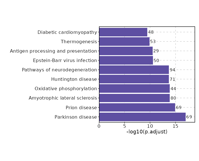 Enrichment Analysis Parkinson disease 69/249 3.545e-20 1.071e-17 4.47 200.1946 PSMC4;UQCRC2;BAX;CALM3;UQCR11;UBE2L6;UBE2L3;PSMD8;COX8A;TXN;UBE2J2;ATP5F1D;ATP5F1E;COX6C;UBE2G1;COX7B;ATP5PD;COX6B1;PSMA7;PSMA4;PSMA5;PSMA2;NDUFAB1;PSMA1;COX5A;NDUFA12;NDUFA13;ATP5F1B;ATP5F1C;PSMB6;PSMB3;PSMB1;PSMB2;UQCRQ;PPIF;NDUFB11;PARK7;COX6A1;NDUFV2;EIF2S1;SEM1;UBA1;TXN2;ATP5MC3;COX7A2;ATP5MC2;UQCRH;UBC;UBB;HSPA5;NDUFS8;NDUFS6;ADORA2A;NDUFS5;PSMD13;NDUFB6;NDUFB4;NDUFB3;CASP9;UQCRFS1;CASP3;NDUFA7;NDUFA6;ADRM1;NDUFA3;NDUFA2;NDUFA1;VDAC1;SLC25A5 1 KEGG_2021_Human Prion disease 69/273 8.021e-18 0 3.9389 155.0535 BAD;MAPK11;PSMC4;UQCRC2;BAX;UQCR11;PSMD8;CREB3L3;COX8A;CSNK2B;ATP5F1D;ATP5F1E;COX6C;COX7B;STIP1;ATP5PD;COX6B1;PSMA7;PSMA4;PSMA5;PSMA2;NDUFAB1;PSMA1;COX5A;NDUFA12;NDUFA13;ATP5F1B;ATP5F1C;PSMB6;PSMB3;PSMB1;PSMB2;RAC2;UQCRQ;PPIF;NDUFB11;COX6A1;NDUFV2;CYBA;EIF2S1;CREB3;SEM1;NOTCH1;ATP5MC3;COX7A2;ATP5MC2;UQCRH;HSPA5;NDUFS8;NDUFS6;NDUFS5;PSMD13;NDUFB6;NDUFB4;NDUFB3;CASP9;UQCRFS1;CASP3;NDUFA7;NDUFA6;ADRM1;NDUFA3;NDUFA2;NDUFA1;SOD1;VDAC1;SLC25A5;CCL5;FYN 2 KEGG_2021_Human Amyotrophic lateral sclerosis 80/364 1.356e-16 0 3.2892 120.1758 BAD;MAPK11;PSMC4;UQCRC2;BAX;PFN1;UQCR11;ACTB;PSMD8;COX8A;GABARAPL1;SETX;ATG2A;GABARAP;ATP5F1D;ATP5F1E;COX6C;TOMM40L;COX7B;ATG101;ATP5PD;COX6B1;PSMA7;PSMA4;PSMA5;PSMA2;NDUFAB1;PSMA1;COX5A;TOMM40;NDUFA12;NDUFA13;ATP5F1B;ATP5F1C;PSMB6;PSMB3;PSMB1;PSMB2;UQCRQ;SRSF3;RAB1A;NDUFB11;TANK;COX6A1;NDUFV2;MAP2K3;EIF2S1;SEM1;VCP;ACTG1;ATP5MC3;COX7A2;ATP5MC2;UQCRH;HSPA5;NCBP1;TNFRSF1B;NDUFS8;NDUFS6;NDUFS5;PSMD13;NDUFB6;NDUFB4;NDUFB3;CASP9;UQCRFS1;CASP3;NDUFA7;NDUFA6;ADRM1;NDUFA3;NDUFA2;NDUFA1;SOD1;VDAC1;BECN1;DCTN6;DCTN5;HNRNPA3;HNRNPA1 3 KEGG_2021_Human Oxidative phosphorylation 44/133 1.78e-16 0 5.7024 206.7966 PPA1;UQCRQ;UQCRC2;ATP6V0D1;NDUFB11;UQCR11;COX6A1;NDUFV2;COX8A;ATP6V0C;ATP6V0B;ATP5MC3;COX7A2;ATP5MC2;UQCRH;ATP6V1H;ATP6V0A2;ATP5F1D;ATP5F1E;COX6C;NDUFS8;NDUFS6;NDUFS5;ATP5ME;COX7B;NDUFB6;NDUFB4;NDUFB3;UQCRFS1;ATP5MG;ATP5MF;NDUFA7;ATP5PD;NDUFA6;NDUFA3;NDUFA2;NDUFA1;COX6B1;NDUFAB1;COX5A;NDUFA12;NDUFA13;ATP5F1B;ATP5F1C 4 KEGG_2021_Human Huntington disease 71/306 3.632e-16 0 3.5169 125.0328 PSMC4;UQCRC2;BAX;STX1A;UQCR11;PSMD8;CREB3L3;AP2S1;COX8A;ATG2A;ATP5F1D;ATP5F1E;COX6C;COX7B;CLTC;CLTB;CLTA;ATG101;ATP5PD;COX6B1;PSMA7;PSMA4;PSMA5;PSMA2;NDUFAB1;PSMA1;COX5A;NDUFA12;NDUFA13;ATP5F1B;ATP5F1C;PSMB6;PSMB3;PSMB1;PSMB2;UQCRQ;PPIF;NDUFB11;COX6A1;NDUFV2;CREB3;SEM1;ATP5MC3;COX7A2;ATP5MC2;UQCRH;NDUFS8;NDUFS6;NDUFS5;PSMD13;NDUFB6;NDUFB4;NDUFB3;CASP9;UQCRFS1;CASP3;NDUFA7;NDUFA6;ADRM1;NDUFA3;NDUFA2;NDUFA1;SOD1;VDAC1;SLC25A5;BECN1;DCTN6;DCTN5;POLR2E;POLR2G;POLR2L 5 KEGG_2021_Human Pathways of neurodegeneration 94/475 3.834e-16 0 2.8915 102.6412 BAD;PSMC4;UQCRC2;BAX;PSMD8;GABARAPL1;ATG2A;GABARAP;CSNK1A1;TOMM40L;ATG101;ATXN1;COX6B1;PSMA7;PSMA4;PSMA5;PSMA2;PSMA1;NDUFA12;NDUFA13;PSMB6;PSMB3;PSMB1;PSMB2;UQCRQ;RAB1A;PARK7;TANK;MAP2K3;FASLG;UQCRH;TNFRSF1B;CDK5;NDUFB6;NDUFB4;NDUFB3;NDUFA7;NDUFA6;ADRM1;NDUFA3;NDUFA2;NDUFA1;SLC25A5;BECN1;HSD17B10;BAK1;MAPK11;CALM3;STX1A;UQCR11;UBE2L6;UBE2L3;COX8A;CSNK2B;UBE2J2;ATP5F1D;ATP5F1E;COX6C;UBE2G1;COX7B;ATP5PD;NDUFAB1;COX5A;TOMM40;ATP5F1B;ATP5F1C;PPIF;NDUFB11;COX6A1;NDUFV2;EIF2S1;SEM1;UBA1;VCP;ATP5MC3;COX7A2;ATP5MC2;UBC;UBB;HSPA5;NDUFS8;NDUFS6;NDUFS5;PSMD13;CASP9;CASP7;UQCRFS1;CASP3;SOD1;KRAS;VDAC1;DCTN6;DCTN5;ATP2A2 6 KEGG_2021_Human Epstein-Barr virus infection 50/202 0 0 3.7955 106.5376 ENTPD1;RUNX3;MAPK11;PSMC4;BAX;PSMD8;AKT2;B2M;HLA-DRB5;GADD45B;GADD45G;HLA-A;HLA-B;HLA-DRB1;RBPJ;PLCG2;HLA-DQB1;CALR;CD3G;CD3D;STAT1;STAT3;HLA-DPB1;HLA-DPA1;CD58;IKBKG;JAK3;HLA-DMA;TAP2;TAP1;RELB;BCL2L11;CCND2;MAP2K3;TRAF3;ISG15;NFKB2;MYD88;SEM1;TRAF5;MAP3K14;NFKBIB;HLA-DRA;IRF7;NFKBIE;PSMD13;CASP9;CASP3;ADRM1;BAK1 7 KEGG_2021_Human Antigen processing and presentation 29/78 0 0 6.7773 188.4169 CD74;KLRC3;HSPA5;KLRC4;TAP2;HSPA4;TAP1;RFX5;IFNG;HLA-DQB1;HLA-DRA;KLRD1;CALR;B2M;HLA-DRB5;RFXANK;HLA-A;HLA-B;CD8B;CD8A;PSME2;HLA-DPB1;PSME1;HLA-DRB1;IFI30;HLA-DPA1;KLRC1;KLRC2;HLA-DMA 8 KEGG_2021_Human Thermogenesis 53/232 0 0 3.4178 89.7695 ACSL5;ACSL4;MAPK11;UQCRC2;ADCY3;UQCR11;ACTB;CREB3L3;COX8A;ATP5F1D;ATP5F1E;COX6C;ATP5ME;COX7B;ATP5MG;ATP5MF;ATP5PD;COX6B1;NDUFAB1;COX5A;NDUFA12;NDUFA13;PRKAG1;ATP5F1B;ATP5F1C;UQCRQ;NDUFB11;COX6A1;NDUFV2;MAP2K3;CREB3;ACTG1;ATP5MC3;COX7A2;ATP5MC2;UQCRH;COA4;COA3;NDUFS8;NDUFS6;NDUFS5;NDUFB6;NDUFB4;NDUFB3;UQCRFS1;COA6;NDUFA7;NDUFA6;NDUFA3;NDUFA2;NDUFA1;KRAS;RPS6KA3 9 KEGG_2021_Human Diabetic cardiomyopathy 48/203 0 0 3.568 90.0417 MAPK11;UQCRC2;UQCR11;AKT2;COX8A;ATP5F1D;ATP5F1E;COX6C;COX7B;CTSD;ATP5PD;PARP1;COX6B1;NDUFAB1;COX5A;NDUFA12;NDUFA13;ATP5F1B;ATP5F1C;RAC2;G6PD;PPP1CA;UQCRQ;PPIF;NDUFB11;COX6A1;NDUFV2;CYBA;ATP5MC3;COX7A2;ATP5MC2;UQCRH;NDUFS8;NDUFS6;NDUFS5;NDUFB6;NDUFB4;NDUFB3;UQCRFS1;NDUFA7;NDUFA6;NDUFA3;NDUFA2;NDUFA1;VDAC1;SLC25A5;GAPDH;ATP2A2 10 KEGG_2021_Human Alzheimer disease 70/369 0 0 2.7139 67.0583 BAD;PSMC4;UQCRC2;CALM3;UQCR11;PSMD8;AKT2;COX8A;CSNK2B;ATG2A;PSENEN;CSNK1A1;ATP5F1D;ATP5F1E;COX6C;COX7B;ATG101;ATP5PD;COX6B1;PSMA7;PSMA4;PSMA5;PSMA2;NDUFAB1;PSMA1;COX5A;NDUFA12;NDUFA13;ATP5F1B;ATP5F1C;PSMB6;PSMB3;PSMB1;PSMB2;UQCRQ;PPIF;NDUFB11;COX6A1;NDUFV2;EIF2S1;SEM1;ATP5MC3;COX7A2;ATP5MC2;UQCRH;NDUFS8;CDK5;NDUFS6;NDUFS5;PSMD13;NDUFB6;NDUFB4;NDUFB3;CASP9;CASP7;UQCRFS1;CASP3;NDUFA7;NDUFA6;ADRM1;NDUFA3;NDUFA2;NDUFA1;KRAS;VDAC1;SLC25A5;GAPDH;BECN1;ATP2A2;HSD17B10 11 KEGG_2021_Human Th1 and Th2 cell differentiation 29/92 0 0 5.2672 121.7025 NFATC3;RUNX3;MAPK11;NFKBIB;IFNG;HLA-DQB1;HLA-DRA;NFKBIE;CD3G;IL2RG;CD3D;TBX21;IL12RB2;IL12RB1;STAT5B;HLA-DRB5;STAT1;LCK;ZAP70;IL2RB;HLA-DPB1;HLA-DRB1;NOTCH1;RBPJ;HLA-DPA1;IKBKG;JAK3;HLA-DMA;STAT5A 12 KEGG_2021_Human Proteasome 20/46 0 0 8.7704 201.528 ADRM1;PSMB9;PSMA7;PSMA4;PSMA5;SEM1;PSMA2;PSMC4;IFNG;PSMA1;PSME2;PSME1;PSMD13;POMP;PSMB8;PSMB6;PSMD8;PSMB3;PSMB1;PSMB2 13 KEGG_2021_Human Non-alcoholic fatty liver disease 37/155 0 0 3.5951 72.246 MAPK11;UQCRQ;UQCRC2;BAX;NDUFB11;UQCR11;COX6A1;BCL2L11;AKT2;NDUFV2;COX8A;EIF2S1;FASLG;COX7A2;UQCRH;COX6C;NDUFS8;NDUFS6;NDUFS5;COX7B;NDUFB6;NDUFB4;NDUFB3;CASP7;UQCRFS1;CASP3;NDUFA7;ND