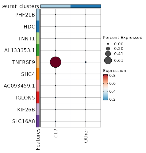 1.577e-277 4.978 0.611 0.049 5.289e-273 TNFRSF9 c17 8.721e-227 3.8097 0.738 0.093 2.925e-222 SLC27A2 c17 1.041e-170 3.7807 0.977 0.269 3.49e-166 GZMB c17 3.974e-152 3.1861 0.638 0.097 1.333e-147 GEM c17 1.481e-146 4.2813 0.217 0.01 4.968e-142 FLT1 c17 1.574e-142 3.6799 0.448 0.05 5.28e-138 ZBTB32 c17 1.582e-141 2.8733 0.747 0.146 5.305e-137 ENTPD1 c17 4.144e-136 2.8506 0.977 0.396 1.39e-131 LAG3 c17 1.744e-134 2.6943 0.787 0.172 5.85e-130 HAVCR2 c17 2.077e-113 2.345 0.941 0.312 6.965e-109 DUSP4 c17 3.375e-113 2.412 0.923 0.293 1.132e-108 PTMS c17 5.684e-110 2.761 0.597 0.111 1.906e-105 TNIP3 c17 5.3e-108 2.0367 1 0.464 1.777e-103 NKG7 c17 3.264e-102 1.7601 1 0.388 1.095e-97 CD8A c17 2.485e-100 2.5317 0.633 0.138 8.334e-96 ZEB2 c17 1.043e-99 2.3047 0.977 0.454 3.5e-95 PRF1 c17 7.487e-97 1.74 1 0.898 2.511e-92 CD7 c17 1.181e-95 2.0326 0.819 0.236 3.961e-91 LINC02446 c17 2.668e-95 2.3074 0.968 0.422 8.947e-91 GZMA c17 3.435e-95 2.3537 0.638 0.139 1.152e-90 GPR34 c17