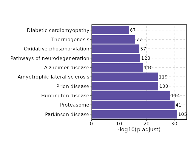 Enrichment Analysis Parkinson disease 105/249 2.494e-34 7.707e-32 5.6773 439.2765 PSMC6;PSMC4;PSMC5;PSMC2;PSMC3;PSMC1;UQCRC1;CALM3;CALM1;UQCR10;UBE2L6;UBE2L3;PSMD9;PSMD8;PSMD6;PSMD3;PSMD4;PSMD1;PSMD2;COX8A;TXN;UBE2J2;TUBB;ATP5F1E;COX6C;COX7B;ATP5PF;ATP5PD;ATP5PB;COX6B1;PSMA6;PSMA7;PSMA4;PSMA5;PSMA2;PSMA3;NDUFAB1;PSMA1;COX5A;NDUFA12;COX5B;GNAI2;PSMA8;PSMB7;ATP5F1A;ATP5F1B;PSMB5;ATP5F1C;PSMB6;TUBA1B;PSMB3;PSMB4;PSMB1;PSMB2;SDHD;SDHB;UQCRQ;PPIF;NDUFB10;PARK7;COX6A1;TUBB6;TUBB3;NDUFV2;MFN1;EIF2S1;SEM1;UBA1;ATP5MC3;HTRA2;COX7A2;ATP5MC2;UQCRH;CYC1;HSPA5;NDUFC2;NDUFC1;NDUFS6;NDUFS5;NDUFS4;NDUFS3;PSMD11;NDUFB9;PSMD13;NDUFB8;NDUFB7;NDUFB6;PSMD14;NDUFB5;NDUFB4;NDUFB3;NDUFB1;UQCRFS1;CASP3;NDUFA9;NDUFA8;NDUFA7;NDUFA6;ADRM1;NDUFA4;NDUFA2;NDUFA1;VDAC3;SLC25A5;MAPK9 1 KEGG_2021_Human Proteasome 41/46 4.328e-33 6.686e-31 62.5711 4662.8155 ADRM1;PSMB9;PSMA6;PSMA7;PSMA4;PSMC6;PSMA5;SEM1;PSMA2;PSMC4;PSMA3;PSMC5;PSMC2;IFNG;PSMA1;PSMC3;PSME2;PSMC1;PSME3;PSME1;PSMD11;PSMD13;POMP;PSMD14;PSMA8;PSMB10;PSMB7;PSMD9;PSMB8;PSMB5;PSMB6;PSMD8;PSMB3;PSMB4;PSMD6;PSMB1;PSMD3;PSMB2;PSMD4;PSMD1;PSMD2 2 KEGG_2021_Human Huntington disease 114/306 3.126e-31 3.22e-29 4.6288 325.1293 PSMC6;PSMC4;PSMC5;PSMC2;PSMC3;PSMC1;UQCRC1;UQCR10;PSMD9;PSMD8;CREB3L4;PSMD6;PSMD3;PSMD4;NRBF2;PSMD1;AP2S1;PSMD2;COX8A;TUBB;ATP5F1E;COX6C;COX7B;CLTA;ATP5PF;ATP5PD;ATP5PB;COX6B1;PSMA6;PSMA7;PSMA4;PSMA5;PSMA2;PSMA3;NDUFAB1;PSMA1;COX5A;NDUFA12;COX5B;PSMA8;PSMB7;ATP5F1A;ATP5F1B;PSMB5;ATP5F1C;PSMB6;TUBA1B;PSMB3;PSMB4;PSMB1;PSMB2;SDHD;SDHB;UQCRQ;PPIF;NDUFB10;COX6A1;TUBB6;TUBB3;NDUFV2;SEM1;ATP5MC3;COX7A2;ATP5MC2;UQCRH;CYC1;AP2M1;NDUFC2;NDUFC1;NDUFS6;NDUFS5;NDUFS4;NDUFS3;PSMD11;NDUFB9;PSMD13;DNAH3;NDUFB8;NDUFB7;NDUFB6;PSMD14;NDUFB5;NDUFB4;NDUFB3;NDUFB1;CASP8;UQCRFS1;CASP3;NDUFA9;NDUFA8;NDUFA7;NDUFA6;ADRM1;NDUFA4;NDUFA2;NDUFA1;SOD1;VDAC3;SLC25A5;BECN1;DCTN6;DCTN3;HDAC1;DCTN2;DCTN5;RB1CC1;DCTN1;MAPK9;POLR2C;POLR2E;POLR2F;POLR2G;POLR2J;POLR2K 3 KEGG_2021_Human Prion disease 100/273 7.39e-27 5.709e-25 4.4832 269.7509 PSMC6;PSMC4;PSMC5;PSMC2;PSMC3;PSMC1;UQCRC1;UQCR10;PSMD9;PSMD8;CREB3L4;PSMD6;PSMD3;PSMD4;PSMD1;PSMD2;COX8A;TUBB;ATP5F1E;COX6C;COX7B;STIP1;ATP5PF;ATP5PD;ATP5PB;COX6B1;PSMA6;PSMA7;PSMA4;PSMA5;PSMA2;PSMA3;NDUFAB1;PSMA1;COX5A;NDUFA12;COX5B;PSMA8;PSMB7;ATP5F1A;ATP5F1B;PSMB5;ATP5F1C;PSMB6;TUBA1B;PSMB3;PSMB4;PSMB1;PSMB2;RAC2;SDHD;SDHB;UQCRQ;PPIF;ATF6B;NDUFB10;COX6A1;TUBB6;TUBB3;NDUFV2;EIF2S1;SEM1;ATP5MC3;COX7A2;ATP5MC2;UQCRH;CYC1;HSPA5;NDUFC2;NDUFC1;NDUFS6;NDUFS5;NDUFS4;NDUFS3;PSMD11;NDUFB9;PSMD13;NDUFB8;NDUFB7;NDUFB6;PSMD14;NDUFB5;NDUFB4;NDUFB3;NDUFB1;UQCRFS1;CASP3;NDUFA9;NDUFA8;NDUFA7;NDUFA6;ADRM1;NDUFA4;NDUFA2;NDUFA1;SOD1;VDAC3;SLC25A5;MAPK9;CCL5 4 KEGG_2021_Human Amyotrophic lateral sclerosis 119/364 1.425e-26 8.806e-25 3.7835 225.1693 NUP93;PSMC6;PSMC4;PSMC5;PSMC2;PSMC3;PSMC1;UQCRC1;PFN1;UQCR10;PSMD9;ACTB;PSMD8;PSMD6;PSMD3;PSMD4;NRBF2;PSMD1;PSMD2;COX8A;GABARAPL2;GABARAPL1;GLE1;SEC13;TUBB;ATP5F1E;COX6C;COX7B;ATP5PF;ATP5PD;ATP5PB;COX6B1;PSMA6;PSMA7;PSMA4;PSMA5;HNRNPA2B1;PSMA2;PSMA3;NDUFAB1;PSMA1;COX5A;NDUFA12;COX5B;PSMA8;PSMB7;ATP5F1A;ATP5F1B;PSMB5;ATP5F1C;PSMB6;TUBA1B;PSMB3;PSMB4;PSMB1;PSMB2;ALYREF;SDHD;SDHB;UQCRQ;SRSF3;RAB1A;NDUFB10;COX6A1;TUBB6;TUBB3;RAE1;NDUFV2;EIF2S1;SEM1;ACTG1;ATP5MC3;COX7A2;ATP5MC2;UQCRH;CYC1;HSPA5;NCBP1;NDUFC2;NDUFC1;NDUFS6;NDUFS5;NDUFS4;NDUFS3;PSMD11;NDUFB9;PSMD13;DNAH3;NDUFB8;NDUFB7;NDUFB6;PSMD14;NDUFB5;NDUFB4;NDUFB3;NDUFB1;UQCRFS1;CASP3;PRPH;NDUFA9;NDUFA8;NDUFA7;NDUFA6;ADRM1;NDUFA4;NDUFA2;NDUFA1;SOD1;NUP37;BECN1;DCTN6;NXT2;DCTN3;DCTN2;DCTN5;RB1CC1;DCTN1;HNRNPA3;HNRNPA1 5 KEGG_2021_Human Alzheimer disease 110/369 4.627e-21 2.383e-19 3.2924 154.1584 PSMC6;PSMC4;PSMC5;PSMC2;PSMC3;PSMC1;UQCRC1;CALM3;CALM1;UQCR10;PSMD9;PSMD8;PSMD6;PSMD3;PSMD4;AKT1;NRBF2;PSMD1;PSMD2;COX8A;PSENEN;TUBB;ATP5F1E;COX6C;COX7B;ATP5PF;ATP5PD;ATP5PB;COX6B1;PSMA6;PSMA7;PSMA4;ADAM17;PSMA5;PSMA2;PSMA3;NDUFAB1;PSMA1;COX5A;NDUFA12;COX5B;PSMA8;PSMB7;ATP5F1A;ATP5F1B;PSMB5;ATP5F1C;PSMB6;TUBA1B;PSMB3;PSMB4;PSMB1;PSMB2;SDHD;SDHB;UQCRQ;PPIF;PPID;NDUFB10;COX6A1;NRAS;TUBB6;TUBB3;NDUFV2;EIF2S1;SEM1;ATP5MC3;COX7A2;ATP5MC2;UQCRH;CYC1;NDUFC2;NDUFC1;NDUFS6;NDUFS5;NDUFS4;NDUFS3;PSMD11;NDUFB9;PSMD13;NDUFB8;NDUFB7;NDUFB6;PSMD14;NDUFB5;NDUFB4;NDUFB3;NDUFB1;CASP8;CASP7;UQCRFS1;CASP3;NDUFA9;NDUFA8;NDUFA7;NDUFA6;CHUK;ADRM1;NDUFA4;NDUFA2;NDUFA1;VDAC3;KRAS;SLC25A5;GAPDH;BECN1;RB1CC1;ATP2A2;HSD17B10;MAPK9 6 KEGG_2021_Human Pathways of neurodegeneration 128/475 4.291e-20 1.894e-18 2.8681 127.9039 PSMC6;PSMC4;PSMC5;PSMC2;PSMC3;PSMC1;UQCRC1;PSMD9;PSMD8;PSMD6;PSMD3;PSMD4;NRBF2;PSMD1;PSMD2;GABARAPL2;GABARAPL1;PRKCB;ATXN1;COX6B1;PSMA6;PSMA7;PSMA4;PSMA5;PSMA2;PSMA3;PSMA1;NDUFA12;PSMA8;PSMB7;PSMB5;PSMB6;TUBA1B;PSMB3;PSMB4;PSMB1;PSMB2;UQCRQ;RAB1A;PARK7;NRAS;TUBB6;TUBB3;MFN1;FASLG;UQCRH;NDUFC2;NDUFC1;NDUFB9;NDUFB8;NDUFB7;NDUFB6;NDUFB5;NDUFB4;NDUFB3;NDUFB1;NDUFA9;NDUFA8;NDUFA7;NDUFA6;ADRM1;NDUFA4;NDUFA2;NDUFA1;SLC25A5;BECN1;HSD17B10;BAK1;CALM3;CALM1;UQCR10;UBE2L6;UBE2L3;COX8A;UBE2J2;TUBB;ATP5F1E;COX6C;COX7B;ATP5PF;ATP5PD;ATP5PB;NDUFAB1;COX5A;COX5B;ATP5F1A;ATP5F1B;ATP5F1C;SDHD;SDHB;PPIF;PPID;NDUFB10;COX6A1;NDUFV2;EIF2S1;SEM1;UBA1;ATP5MC3;HTRA2;COX7A2;ATP5MC2;CYC1;HSPA5;NDUFS6;NDUFS5;NDUFS4;NDUFS3;PSMD11;PSMD13;DNAH3;PSMD14;CASP8;CASP7;UQCRFS1;CASP3;PRPH;SOD1;VDAC3;KRAS;DCTN6;DCTN3;DCTN2;DCTN5;RB1CC1;ATP2A2;DCTN1;MAPK9 7 KEGG_2021_Human Oxidative phosphorylation 57/133 1.22e-19 4.714e-18 5.7397 249.9616 ATP6V1E1;PPA1;SDHD;SDHB;UQCRQ;UQCRC1;NDUFB10;UQCR10;COX6A1;NDUFV2;COX8A;COX17;ATP5MC3;COX7A2;ATP5MC2;UQCRH;COX15;CYC1;COX11;NDUFC2;NDUFC1;ATP5F1E;COX6C;NDUFS6;NDUFS5;NDUFS4;NDUFS3;NDUFB9;COX7B;NDUFB8;NDUFB7;NDUFB6;NDUFB5;NDUFB4;NDUFB3;NDUFB1;UQCRFS1;ATP5MG;ATP5MF;NDUFA9;ATP5PF;NDUFA8;NDUFA7;ATP5PD;NDUFA6;ATP5PB;NDUFA4;NDUFA2;NDUFA1;COX6B1;NDUFAB1;COX5A;NDUFA12;COX5B;ATP5F1A;ATP5F1B;ATP5F1C 8 KEGG_2021_Human Thermogenesis 77/232 4.561e-18 1.566e-16 3.8179 152.4453 ACSL5;ACSL4;UQCRC1;SMARCB1;UQCR10;ACTB;CREB3L4;COX8A;ACTL6A;NDUFAF1;SIRT6;ATP5F1E;COX6C;COX7B;ATP5MG;ATP5MF;ATP5PF;ATP5PD;ATP5PB;COX6B1;NDUFAB1;COX5A;NDUFA12;PRKAG1;COX5B;ATP5F1A;ATP5F1B;ATP5F1C;SDHD;SDHB;UQCRQ;COX20;NDUFB10;COX6A1;NRAS;ND