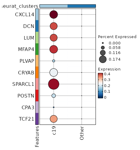 seurat_clusters: c19 Markers Showing top 100 markers ordered by p_val_adj ascendingly, then abs(avg_log2FC) descendingly. Use 'Download the entire data' button to download all significant markers by 'p_val_adj < 0.05 & avg_log2FC > 0'.