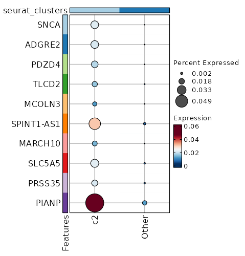 seurat_clusters: c2 Markers Showing top 100 markers ordered by p_val_adj ascendingly, then abs(avg_log2FC) descendingly. Use 'Download the entire data' button to download all significant markers by 'p_val_adj < 0.05 & avg_log2FC > 0'.
