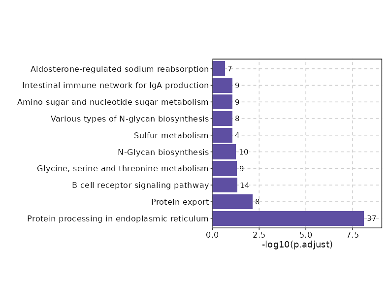 Enrichment Analysis Protein processing in endoplasmic reticulum 37/171 0 0 4.2044 102.3735 SEC24A;SELENOS;DNAJB11;SEC24D;HSPA1B;RRBP1;HSP90B1;PDIA4;XBP1;WFS1;EDEM1;EDEM2;PDIA6;CKAP4;HYOU1;STT3A;UBE2J1;TXNDC5;SIL1;HSPA5;SSR3;SSR4;EIF2AK4;EIF2AK3;DNAJC3;RPN1;SEL1L;RPN2;ERLEC1;SEC61B;DNAJC5B;SYVN1;DERL3;HERPUD1;LMAN1;SEC61A1;UGGT2 1 KEGG_2021_Human Protein export 8/23 0.0001 0.0073 7.9834 78.9984 HSPA5;SPCS3;SPCS2;SPCS1;SEC61A1;SEC61B;SRPRB;SEC11C 2 KEGG_2021_Human B cell receptor signaling pathway 14/81 0.0005 0.0473 3.1342 23.8818 LYN;JUN;LILRB1;LILRB4;FCGR2B;BLNK;SYK;BTK;LILRA2;RASGRP3;CD79B;CD79A;CD19;PLCG2 3 KEGG_2021_Human Glycine, serine and threonine metabolism 9/40 0.0007 0.0504 4.3455 31.5814 PGAM2;AMT;GATM;PSAT1;GLDC;MAOB;GCSH;CBS;PHGDH 4 KEGG_2021_Human N-Glycan biosynthesis 10/50 0.001 0.0554 3.7432 26.0149 ALG14;DPM3;B4GALT2;RPN1;RPN2;ALG9;ALG5;ALG2;STT3A;MGAT3 5 KEGG_2021_Human Sulfur metabolism 4/10 0.0024 0.0874 9.9522 59.9756 TST;PAPSS1;SUOX;PAPSS2 6 KEGG_2021_Human Various types of N-glycan biosynthesis 8/39 0.0026 0.0874 3.8596 23.0128 ALG9;ALG14;ALG2;STT3A;B4GALT2;RPN1;HEXB;RPN2 7 KEGG_2021_Human Amino sugar and nucleotide sugar metabolism 9/48 0.0027 0.0874 3.4527 20.3926 CHIT1;NAGK;UGDH;HEXB;UAP1;NANS;GMPPA;GMPPB;PGM3 8 KEGG_2021_Human Intestinal immune network for IgA production 9/48 0.0027 0.0874 3.4527 20.3926 IL15;CD86;CD40;TNFRSF13B;TNFRSF17;HLA-DOB;HLA-DQA2;CCR10;HLA-DQA1 8 KEGG_2021_Human Aldosterone-regulated sodium reabsorption 7/37 0.0075 0.2168 3.4871 17.0609 INSR;PRKCG;IGF1;SCNN1G;SCNN1B;IRS1;NEDD4L 10 KEGG_2021_Human Glyoxylate and dicarboxylate metabolism 6/30 0.0099 0.2601 3.7344 17.235 AMT;GLDC;GCSH;MCEE;HYI;ACSS2 11 KEGG_2021_Human Cell adhesion molecules 17/148 0.0119 0.2861 1.9445 8.6198 CADM1;CD86;HLA-DOB;SDC1;CDH15;CD276;ALCAM;CLDN14;ITGA8;ITGA6;CD40;CNTNAP1;NRXN1;MPZL1;HLA-DQA2;HLA-DQA1;NRCAM 12 KEGG_2021_Human Lysosome 15/128 0.0147 0.3271 1.9877 8.3864 IDUA;LAMP2;ARSA;ATP6V0A1;FUCA2;NPC2;CTSZ;ABCB9;CTSH;CTSF;SCARB2;CD63;HEXB;NAGLU;GUSB 13 KEGG_2021_Human Basal cell carcinoma 9/63 0.0166 0.3424 2.4916 10.2137 PTCH2;WNT5B;WNT6;WNT11;DVL3;FZD3;WNT10A;FZD6;CDKN1A 14 KEGG_2021_Human Glycosaminoglycan degradation 4/19 0.0283 0.5115 3.979 14.1798 IDUA;HEXB;NAGLU;GUSB 15 KEGG_2021_Human Protein digestion and absorption 12/103 0.0284 0.5115 1.9722 7.0271 COL24A1;COL9A2;COL9A3;SLC1A5;PRCP;COL13A1;SLC7A7;COL4A3;COL4A4;COL4A6;COL19A1;COL11A2 16 KEGG_2021_Human Primary immunodeficiency 6/38 0.0301 0.5115 2.7996 9.8089 BTK;CD40;TNFRSF13B;CD79A;CD19;BLNK 17 KEGG_2021_Human Vibrio cholerae infection 7/50 0.036 0.5714 2.4312 8.0814 KDELR2;SEC61B;PDIA4;KDELR3;SEC61A1;PLCG2;ATP6V0A1 18 KEGG_2021_Human Ascorbate and aldarate metabolism 5/30 0.0376 0.5714 2.985 9.7958 UGT2B17;AKR1A1;UGDH;ALDH2;GUSB 19 KEGG_2021_Human Fc gamma R-mediated phagocytosis 11/97 0.0413 0.5962 1.9119 6.095 MARCKS;CFL2;PRKCG;PRKCD;PLA2G4A;PIP5K1B;PLCG2;LYN;FCGR2B;SCIN;SYK 20 KEGG_2021_Human