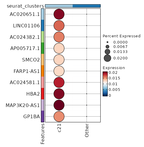 seurat_clusters: c21 Markers Showing top 100 markers ordered by p_val_adj ascendingly, then abs(avg_log2FC) descendingly. Use 'Download the entire data' button to download all significant markers by 'p_val_adj < 0.05 & avg_log2FC > 0'.
