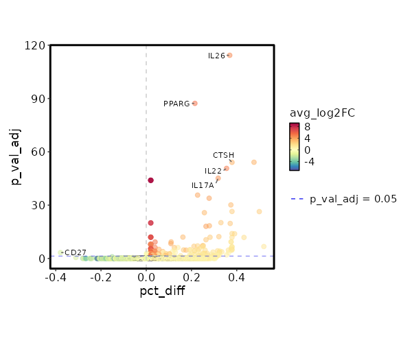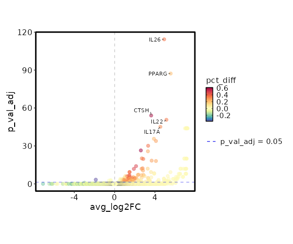 1.423e-119 4.918 0.38 0.011 4.772e-115 IL26 c21 1.625e-92 5.5619 0.22 0.005 5.449e-88 PPARG c21 2.504e-59 3.6277 0.66 0.071 8.399e-55 CTSH c21 6.205e-56 5.1383 0.38 0.025 2.081e-51 IL22 c21 2.152e-50 4.5402 0.34 0.022 7.216e-46 IL17A c21 3.081e-49 9.2153 0.02 0 1.033e-44 AC020651.1 c21 3.081e-49 8.9566 0.02 0 1.033e-44 LINC01106 c21 3.081e-49 8.9055 0.02 0 1.033e-44 AC024382.1 c21 3.081e-49 8.6822 0.02 0 1.033e-44 AP005717.1 c21 3.081e-49 8.6822 0.02 0 1.033e-44 SMCO2 c21 3.081e-49 8.6641 0.02 0 1.033e-44 FARP1-AS1 c21 6.793e-41 3.8989 0.24 0.013 2.278e-36 ADAM12 c21 3.862e-39 4.1021 0.3 0.022 1.295e-34 COL5A3 c21 2.271e-35 3.325 0.42 0.046 7.616e-31 RORC c21 1.075e-31 2.6025 0.84 0.219 3.604e-27 CCR6 c21 5.239e-31 3.3021 0.28 0.023 1.757e-26 IL17RE c21 2.164e-25 2.6957 0.38 0.05 7.259e-21 IL23R c21 2.955e-25 7.9879 0.02 0 9.91e-21 AC024581.1 c21 3.015e-25 7.4878 0.02 0 1.011e-20 GP1BA c21 3.015e-25 7.317 0.02 0 1.011e-20 AC005046.1 c21