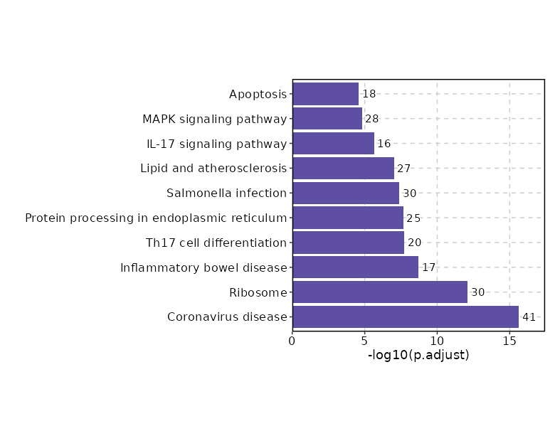 Enrichment Analysis Coronavirus disease 41/232 8.413e-19 2.297e-16 6.674 277.766 RPL22L1;RPL27;RPL10;RPL13;C3AR1;RPL17;RPL27A;RPS20;RPS25;RPL3;RPL32;RPL35;RPL34;RPL9;RPS18;RPS19;RPS10;RPL38;RPS12;RPS14;JUN;TLR2;RPS27A;FOS;HBEGF;RPLP0;RPLP2;RPLP1;RPS6;RPSA;CSF2;TNF;NLRP3;RPS5;RPS3;NFKB1;RPS3A;IL2;NFKBIA;RPL36A;RPL10A 1 KEGG_2021_Human Ribosome 30/158 0 0 7.1826 235.5927 RPS6;RPSA;RPL22L1;RPL27;RPL10;RPL13;RPS5;RPL17;RPS3;RPL27A;RPS20;RPS25;RPL3;RPL32;RPL35;RPL34;RPL9;RPS18;RPS19;RPS10;RPL38;RPS12;RPS14;RPS3A;RPL36A;RPS27A;RPLP0;RPLP2;RPLP1;RPL10A 2 KEGG_2021_Human Inflammatory bowel disease 17/65 0 0 10.6776 262.4486 TGFB1;JUN;IL2;TLR2;IL23A;IL18R1;TNF;SMAD3;IFNGR1;STAT4;NFKB1;IL17A;IL22;IL23R;RORC;RORA;IL18RAP 3 KEGG_2021_Human Th17 cell differentiation 20/107 0 0 6.9492 153.2407 TGFB1;CD4;IL23A;AHR;SMAD3;NFKB1;IL23R;RORC;RORA;HSP90AA1;JUN;IL2;NFKBIA;RARA;PPP3CA;IFNGR1;FOS;IL17A;IL22;HSP90AB1 4 KEGG_2021_Human Protein processing in endoplasmic reticulum 25/171 0 0 5.2012 112.6502 ERN1;HSPA1A;HSPA1B;PPP1R15A;HSP90B1;PDIA4;PDIA3;XBP1;HSP90AA1;HSPA5;HSPA8;SSR3;SSR4;BCL2;TRAM1;RPN2;DNAJB1;SEC61G;SEC61B;BCAP31;DNAJA1;DAD1;P4HB;HSP90AB1;SEC61A1 5 KEGG_2021_Human Salmonella infection 30/249 0 0 4.1782 87.0929 CYFIP1;AHNAK;MYC;S100A10;MYL12A;TXN;ANXA2;JUN;TUBB2A;TLR2;FOS;TUBB4B;TUBA1A;TUBA1C;TNF;HSP90B1;KIF5C;NLRP3;FLNB;RPS3;M6PR;NFKB1;HSP90AA1;NFKBIA;BCL2;CYCS;TRADD;DYNLT3;HSP90AB1;CYTH3 6 KEGG_2021_Human Lipid and atherosclerosis 27/215 0 0 4.3666 86.517 HSPA1A;CALM1;HSPA1B;ABCA1;XBP1;JUN;TLR2;VLDLR;PPP3CA;FOS;CD40LG;PLCB3;PLCB1;ERN1;NCF1;TNF;HSP90B1;NLRP3;NFKB1;NCF4;HSP90AA1;HSPA5;HSPA8;NFKBIA;BCL2;CYCS;HSP90AB1 7 KEGG_2021_Human IL-17 signaling pathway 16/94 0 0 6.165 102.0172 HSP90AA1;JUN;CCL20;NFKBIA;CSF2;TRADD;TNFAIP3;TNF;HSP90B1;JUND;FOS;IL17RE;NFKB1;IL17A;FOSB;HSP90AB1 8 KEGG_2021_Human MAPK signaling pathway 28/294 0 0 3.1925 46.2954 CACNA2D4;HSPA1A;HSPA1B;FLT3LG;MYC;JUND;GADD45B;DUSP6;JUN;DUSP1;AREG;PPP3CA;FOS;KIT;TGFB1;TNF;FLNB;MAP3K8;NFKB1;CACNB3;NR4A1;HSPA8;RASGRF2;TRADD;HSPB1;MKNK1;ERBB3;RPS6KA5 9 KEGG_2021_Human Apoptosis 18/142 0 0 4.366 60.3792 ERN1;TNF;LMNA;GADD45B;NFKB1;CTSB;JUN;PTPN13;NFKBIA;BCL2;CYCS;BCL2A1;TRADD;CTSH;MCL1;FOS;TUBA1A;TUBA1C 10 KEGG_2021_Human Pathways in cancer 40/531 0 0 2.4891 34.2695 MYC;GSTM2;JUN;RARA;EGLN3;IFNGR1;STAT4;FOS;PLCB3;PLCB1;CDKN1A;TPM3;ZBTB16;HSP90B1;NFKB1;IL5RA;HSP90AA1;CDK6;BCL2;HSP90AB1;IL23A;CALM1;EPAS1;FLT3LG;GADD45B;IL23R;MGST3;KIT;PTGER2;PTGER4;TGFB1;CCND2;SMAD3;IL7R;IL2;NFKBIA;CYCS;PLD1;WNT1;RPS6KA5 11 KEGG_2021_Human JAK-STAT signaling pathway 19/162 0 0 3.9985 53.2577 OSM;IL23A;CSF2;CCND2;MYC;CISH;IL7R;IL23R;IL5RA;IL2;BCL2;IL9R;SOCS2;MCL1;IFNGR1;STAT4;IL22;CDKN1A;FHL1 12 KEGG_2021_Human Cytokine-cytokine receptor interaction 26/295 0 0.0001 2.9217 35.4541 CD4;IL23A;TNFSF14;IL17RE;IL23R;TNFSF12;CCR2;CCL20;IL18R1;CCR6;IFNGR1;IL17A;CD40LG;IL22;TGFB1;OSM;CSF2;TNF;IL7R;IL5RA;IL18RAP;IL2;IL9R;TNFRSF25;LTB;TNFSF13B 13 KEGG_2021_Human Protein export 7/23 0 0.0001 13.0086 156.0016 HSPA5;SPCS3;SPCS2;SEC61A1;SEC61G;SEC61B;SRPRB 14 KEGG_2021_Human PI3K-Akt signaling pathway 29/354 0 0.0001 2.7022 32.2366 FLT3LG;MYC;TLR2;SGK3;AREG;KIT;CDKN1A;RPS6;OSM;HSP90B1;CCND2;NFKB1;COL6A1;IL7R;NR4A1;THEM4;HSP90AA1;ITGA5;IL2;RBL2;CDK6;BCL2;ERBB3;YWHAQ;MCL1;YWHAH;YWHAZ;HSP90AB1;PPP2R2B 15 KEGG_2021_Human Hepatitis B 18/162 0 0.0001 3.7557 44.7813 TGFB1;TNF;MYC;SMAD3;EGR2;EGR3;NFKB1;JUN;TLR2;NFKBIA;BCL2;CYCS;DDX3X;YWHAQ;STAT4;FOS;YWHAZ;CDKN1A 16 KEGG_2021_Human Parathyroid hormone synthesis, secretion and action 14/106 0 0.0002 4.556 52.6105 RUNX2;EGR1;JUND;NR4A2;CYP27B1;MMP25;BCL2;PLD1;PDE4D;FOS;HBEGF;PLCB3;PLCB1;CDKN1A 17 KEGG_2021_Human Measles 16/139 0 0.0002 3.9004 43.6882 HSPA1A;HSPA1B;SLAMF1;CCND2;NFKB1;JUN;HSPA8;IL2;TLR2;NFKBIA;CDK6;BCL2;CYCS;TRADD;TNFAIP3;FOS 18 KEGG_2021_Human Legionellosis 10/57 0 0.0002 6.3455 70.6393 HSPA8;TLR2;EEF1A1;NFKBIA;EEF1G;HSPA1A;CYCS;HSPA1B;TNF;NFKB1 19 KEGG_2021_Human Pathogenic Escherichia coli infection 19/197 0 0.0004 3.2064 33.5711 CYFIP1;JUN;TUBB2A;TMED10;FOS;TUBB4B;TUBA1A;TUBA1C;TNF;NLRP3;RPS3;NFKB1;NCL;BAIAP2;NFKBIA;CYCS;TRADD;MYO1D;CYTH3 20 KEGG_2021_Human