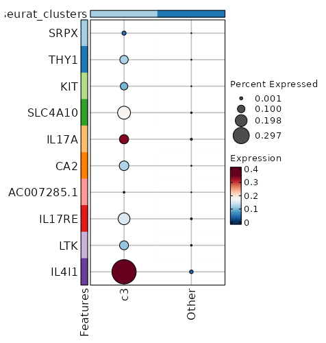 0 2.0202 0.978 0.597 0 FOSB c3 4.104e-296 1.5784 0.998 0.823 1.376e-291 FOS c3 5.305e-266 3.423 0.278 0.028 1.779e-261 IL23R c3 9.386e-261 3.4614 0.297 0.034 3.148e-256 IL4I1 c3 1.037e-260 1.3775 0.992 0.622 3.478e-256 IL7R c3 7.702e-241 1.9102 0.867 0.47 2.583e-236 NR4A1 c3 3.064e-240 1.4214 0.979 0.607 1.028e-235 ANXA1 c3 7.391e-240 1.6916 0.81 0.364 2.479e-235 LGALS3 c3 8.292e-240 1.2084 0.994 0.925 2.781e-235 DUSP1 c3 1.325e-234 1.8433 0.969 0.786 4.443e-230 JUN c3 2.324e-228 2.7461 0.623 0.201 7.796e-224 TNF c3 3.483e-218 2.4859 0.392 0.077 1.168e-213 TNFSF13B c3 1.061e-217 1.5932 0.779 0.309 3.56e-213 CD40LG c3 4.615e-211 2.3305 0.533 0.153 1.548e-206 AC020571.1 c3 5.18e-211 1.008 0.998 0.912 1.737e-206 VIM c3 1.37e-208 2.5947 0.606 0.221 4.594e-204 EGR1 c3 2.935e-206 0.529 1 0.999 9.844e-202 RPLP1 c3 4.336e-206 1.1528 0.958 0.525 1.454e-201 KLRB1 c3 4.765e-201 4.2664 0.153 0.008 1.598e-196 SLC4A10 c3 1.878e-198 1.273 0.989 0.866 6.297e-194 TNFAIP3 c3
