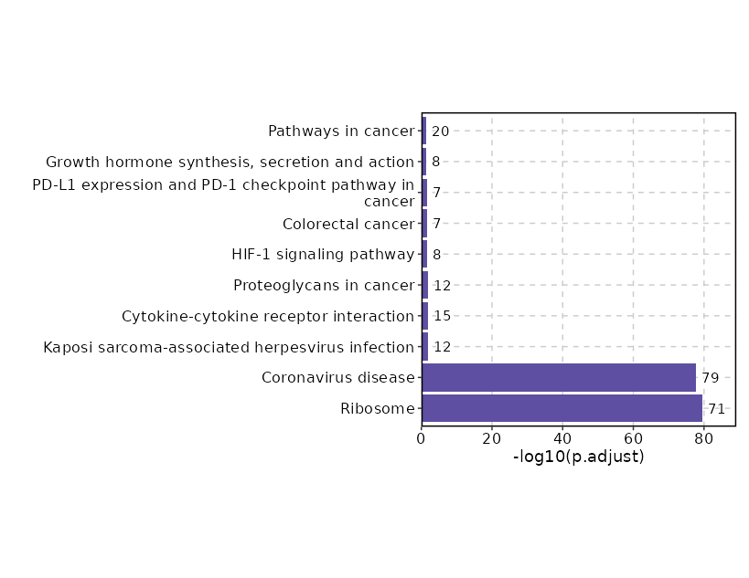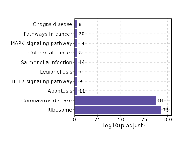 Enrichment Analysis Ribosome 75/158 1.761e-96 4.015e-94 80.2254 17688.2827 RPL22;RPS8;RPL21;RPS9;RPL24;RPS6;RPS7;RPSA;FAU;RPL26;RPL28;RPL27;RPL29;RPL11;RPL10;RPL13;RPL12;RPS4Y1;RPL14;RPS5;RPL17;RPS2;RPS3;RPL19;RPL18;RPL41;RPS27;RPS29;RPS28;RPL27A;RPS21;RPS20;RPS23;RPS25;RPS24;RPL5;RPL6;RPL3;RPL31;RPL30;RPL4;RPL32;RPL35;RPL34;RPL9;RPL7;RPL8;RPS16;RPS15;RPS18;RPS19;RPL37;RPL36;RPL39;RPS10;RPL38;RPS12;RPS14;RPS13;RPL13A;RPS3A;RPL37A;RPL36A;RPS15A;RPS27A;RPL35A;RPL23A;UBA52;RPLP0;RPLP2;RPLP1;RPL10A;RPS4X;RPL18A;RPL7A 1 KEGG_2021_Human Coronavirus disease 81/232 6.621e-91 7.548e-89 48.7846 10129.8854 RPL22;RPL21;RPL24;RPL26;RPL28;RPL27;RPL29;RPL11;RPL10;RPL13;RPL12;RPS4Y1;RPL14;RPL17;RPL19;RPL18;RPL41;RPS27;RPS29;RPS28;RPL27A;RPS21;RPS20;RPS23;RPS25;RPS24;RPL5;RPL6;RPL3;RPL31;RPL30;RPL4;RPL32;RPL35;RPL34;RPL9;RPL7;RPL8;RPS16;RPS15;RPS18;RPS19;RPL37;RPL36;RPL39;RPS10;RPL38;RPS12;RPS14;RPS13;ACE;JUN;RPS15A;RPS27A;FOS;RPLP0;RPLP2;RPLP1;RPL18A;RPS8;RPS9;RPS6;RPS7;RPSA;FAU;TNF;RPS5;RPS2;RPS3;RPL13A;RPS3A;IL2;NFKBIA;RPL37A;RPL36A;RPL35A;RPL23A;UBA52;RPL10A;RPS4X;RPL7A 2 KEGG_2021_Human Apoptosis 11/142 0 0.0006 5.7668 67.0815 ERN1;TNF;LMNA;AKT3;GADD45B;JUN;NFKBIA;TRADD;MCL1;FOS;TUBA1A 3 KEGG_2021_Human IL-17 signaling pathway 9/94 0 0.0006 7.238 82.8562 JUN;NFKBIA;TRADD;TNFAIP3;TNF;JUND;FOS;FOSB;HSP90AB1 4 KEGG_2021_Human Legionellosis 7/57 0 0.0008 9.521 102.8571 CLK1;EEF1A1;NFKBIA;EEF1G;HSPA1B;TNF;CR1 5 KEGG_2021_Human Salmonella infection 14/249 0 0.0008 4.113 44.083 AHNAK;AKT3;MYC;S100A10;JUN;FOS;TUBA1A;TNF;RPS3;TCF7;NFKBIA;TRADD;DYNLT3;HSP90AB1 6 KEGG_2021_Human Colorectal cancer 8/86 0 0.0013 6.9893 70.6245 JUN;TGFA;AREG;AKT3;MYC;GADD45B;FOS;TCF7 7 KEGG_2021_Human MAPK signaling pathway 14/294 0.0001 0.003 3.444 30.7431 HSPA1B;AKT3;FLT3LG;MYC;JUND;GADD45B;JUN;DUSP1;TGFA;AREG;FOS;TNF;NR4A1;TRADD 8 KEGG_2021_Human Pathways in cancer 20/531 0.0001 0.003 2.7217 24.2115 AKT3;MYC;JUN;FOS;WNT7A;PLCB1;IL5RA;HSP90AB1;IL23A;FLT3LG;GADD45B;MGST3;TGFA;PTGER2;PTGER4;CXCR4;TCF7;IL7R;IL2;NFKBIA 9 KEGG_2021_Human Chagas disease 8/102 0.0001 0.003 5.7949 51.5138 TNF;AKT3;ACE;JUN;IL2;NFKBIA;FOS;PLCB1 10 KEGG_2021_Human NF-kappa B signaling pathway 8/104 0.0002 0.003 5.6736 49.6669 TNF;GADD45B;NFKBIA;TRADD;TNFAIP3;LTB;CD40LG;TNFSF13B 11 KEGG_2021_Human T cell receptor signaling pathway 8/104 0.0002 0.003 5.6736 49.6669 CD4;TNF;AKT3;JUN;IL2;NFKBIA;FOS;CD40LG 11 KEGG_2021_Human Th17 cell differentiation 8/107 0.0002 0.0034 5.5008 47.0693 CD4;IL23A;RORA;JUN;IL2;NFKBIA;FOS;HSP90AB1 13 KEGG_2021_Human TNF signaling pathway 8/112 0.0003 0.0043 5.235 43.1508 TNF;AKT3;JUNB;JUN;NFKBIA;TRADD;TNFAIP3;FOS 14 KEGG_2021_Human Lipid and atherosclerosis 11/215 0.0004 0.0057 3.6894 29.0811 HSPA1B;AKT3;XBP1;JUN;FOS;CD40LG;PLCB1;ERN1;TNF;NFKBIA;HSP90AB1 15 KEGG_2021_Human Osteoclast differentiation 8/127 0.0006 0.0084 4.5717 33.815 TNF;AKT3;JUND;JUNB;JUN;NFKBIA;FOS;FOSB 16 KEGG_2021_Human Kaposi sarcoma-associated herpesvirus infection 10/193 0.0006 0.0084 3.7298 27.51 AKT3;MYC;JUN;RPS27A;FOS;ZFP36;TCF7;NFKBIA;TRADD;UBA52 17 KEGG_2021_Human PI3K-Akt signaling pathway 14/354 0.0009 0.0109 2.8275 19.9621 AKT3;FLT3LG;MYC;TGFA;AREG;RPS6;IL7R;NR4A1;THEM4;IL2;EIF4B;MCL1;DDIT4;HSP90AB1 18 KEGG_2021_Human C-type lectin receptor signaling pathway 7/104 0.0009 0.0109 4.896 34.3073 IL23A;TNF;AKT3;EGR3;JUN;IL2;NFKBIA 19 KEGG_2021_Human Leishmaniasis 6/77 0.001 0.0112 5.7211 39.6241 JUN;EEF1A1;NFKBIA;TNF;CR1;FOS 20 KEGG_2021_Human