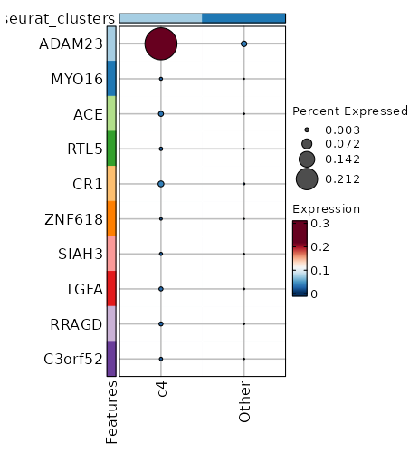 seurat_clusters: c4 Markers Showing top 100 markers ordered by p_val_adj ascendingly, then abs(avg_log2FC) descendingly. Use 'Download the entire data' button to download all significant markers by 'p_val_adj < 0.05 & avg_log2FC > 0'.