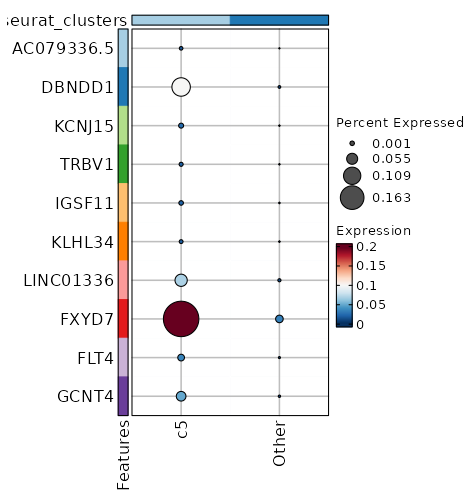 seurat_clusters: c5 Markers Showing top 100 markers ordered by p_val_adj ascendingly, then abs(avg_log2FC) descendingly. Use 'Download the entire data' button to download all significant markers by 'p_val_adj < 0.05 & avg_log2FC > 0'.