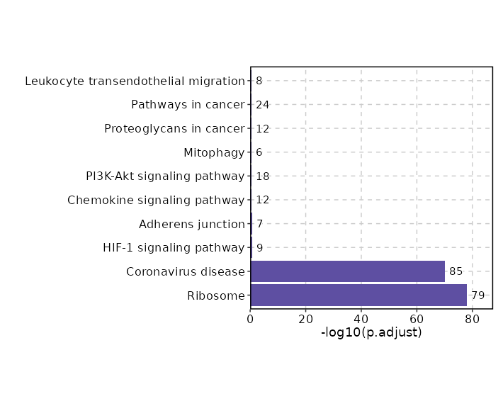 Enrichment Analysis Ribosome 79/158 4.345e-81 1.043e-78 41.307 7643.471 RPL22;RPS8;RPL21;RPS9;RPL24;RPS6;RPL23;RPS7;RPSA;FAU;RPL26;RPL28;RPL27;RPL29;RPL11;RPL10;RPL13;RPL12;RPS4Y1;RPL15;RPL14;RPS5;RPL17;RPS2;RPS3;RPL19;RPL18;RPL41;RPS27;RPS26;RPS29;RPS28;RPL27A;RPS21;RPS20;RPS23;RPS25;RPS24;RPL5;RPL6;RPL3;RPL31;RPL30;RPL4;RPL32;RPL35;RPL34;RPL9;RPL7;RPL8;RPS16;RPS15;RPS18;RPS17;RPS19;RPL37;RPL36;RPL39;RPS10;RPL38;RPS12;RPS11;RPS14;RPS13;RPL13A;RPS3A;RPL37A;RPL36A;RPS15A;RPS27A;RPL35A;RPL23A;UBA52;RPLP0;RPLP2;RPL10A;RPS4X;RPL18A;RPL7A 1 KEGG_2021_Human Coronavirus disease 85/232 5.52e-73 6.624e-71 24.1096 4011.3683 RPL22;RPL21;RPL24;MX2;RPL23;RPL26;RPL28;RPL27;RPL29;RPL11;RPL10;RPL13;RPL12;RPS4Y1;RPL15;RPL14;RPL17;RPL19;RPL18;RPL41;PRKCA;RPS27;RPS26;RPS29;RPS28;RPL27A;RPS21;RPS20;RPS23;RPS25;RPS24;RPL5;RPL6;RPL3;RPL31;RPL30;RPL4;RPL32;RPL35;RPL34;RPL9;RPL7;RPL8;RPS16;RPS15;RPS18;RPS17;RPS19;RPL37;RPL36;RPL39;RPS10;RPL38;RPS12;RPS11;RPS14;RPS13;RPS15A;RPS27A;STAT3;RPLP0;RPLP2;RPL18A;RPS8;RPS9;RPS6;RPS7;RPSA;FAU;IL6ST;RPS5;RPS2;RPS3;NFKB1;IL6R;RPL13A;RPS3A;RPL37A;RPL36A;RPL35A;RPL23A;UBA52;RPL10A;RPS4X;RPL7A 2 KEGG_2021_Human HIF-1 signaling pathway 9/109 0.0031 0.1959 3.2313 18.6926 RPS6;PRKCA;NFKB1;IGF1R;IL6R;PDK1;LDHB;IFNGR2;STAT3 3 KEGG_2021_Human Adherens junction 7/71 0.0033 0.1959 3.9197 22.4389 ACTN1;LMO7;TGFBR2;LEF1;YES1;TCF7;IGF1R 4 KEGG_2021_Human Chemokine signaling pathway 12/192 0.0068 0.3169 2.397 11.9533 NCF1;NFKB1;PTK2;PXN;RASGRP2;GRK6;CCR7;STAT3;TIAM1;GNAI1;CXCR4;JAK3 5 KEGG_2021_Human PI3K-Akt signaling pathway 18/354 0.0092 0.3169 1.9322 9.0581 LPAR6;FLT3LG;PRKCA;PTK2;SGK1;TGFA;AREG;JAK3;RPS6;CCND3;NFKB1;EFNA1;IGF1R;THEM4;IL6R;ITGA6;EIF4B;DDIT4 6 KEGG_2021_Human Mitophagy 6/68 0.0107 0.3169 3.4621 15.6973 ATG9B;TOMM7;PRKN;RPS27A;UBA52;BNIP3 7 KEGG_2021_Human Proteoglycans in cancer 12/205 0.0112 0.3169 2.234 10.0388 ANK3;PRKCA;PTK2;TFAP4;CTSL;STAT3;WNT7A;RPS6;PXN;IGF1R;EIF4B;TIAM1 8 KEGG_2021_Human Pathways in cancer 24/531 0.0119 0.3169 1.7115 7.5835 LEF1;PRKCA;GSTM3;IFNGR2;STAT3;WNT7A;JAK3;IL6ST;NFKB1;ITGA6;LPAR6;LRP6;FLT3LG;PTK2;TGFA;GNAI1;CXCR4;CCND3;ARHGEF11;TCF7;RASGRP2;IGF1R;IL6R;TGFBR2 9 KEGG_2021_Human Leukocyte transendothelial migration 8/114 0.0132 0.3169 2.7038 11.7 ACTN1;NCF1;PRKCA;PTK2;PXN;TXK;GNAI1;CXCR4 10 KEGG_2021_Human Hematopoietic cell lineage 7/99 0.0191 0.4013 2.7228 10.778 CD5;FLT3LG;IL6R;GP5;ITGA6;CD37;CD55 11 KEGG_2021_Human Viral protein interaction with cytokine and cytokine receptor 7/100 0.0201 0.4013 2.6934 10.5281 IL6ST;TNFRSF10D;TNFRSF10A;IL6R;CCR7;LTA;CXCR4 12 KEGG_2021_Human mTOR signaling pathway 9/154 0.0262 0.4467 2.2233 8.0947 RPS6;ULK2;LRP6;PRKCA;IGF1R;SGK1;EIF4B;WNT7A;DDIT4 13 KEGG_2021_Human Th17 cell differentiation 7/107 0.0278 0.4467 2.504 8.9681 IL6ST;NFKB1;IL6R;TGFBR2;IFNGR2;STAT3;JAK3 14 KEGG_2021_Human FoxO signaling pathway 8/131 0.0279 0.4467 2.3281 8.3311 S1PR1;IGF1R;TGFBR2;ATM;SGK1;STAT3;KLF2;BNIP3 15 KEGG_2021_Human RNA transport 10/186 0.0327 0.473 2.0357 6.9647 EEF1A1;EIF2S3;EIF4EBP3;FUS;PABPC4;PABPC1;EIF4B;EIF3H;EIF3F;EIF3E 16 KEGG_2021_Human Cytokine-cytokine receptor interaction 14/295 0.0335 0.473 1.7886 6.0746 IL17RA;IL16;CCR7;IFNGR2;CXCR4;EDAR;IL6ST;TNFRSF10D;TNFRSF10A;IL6R;TGFBR2;EDA;LTB;LTA 17 KEGG_2021_Human Hepatocellular carcinoma 9/168 0.0422 0.5625 2.0261 6.414 LEF1;LRP6;PRKCA;TCF7;IGF1R;GSTM3;TGFBR2;TGFA;WNT7A 18 KEGG_2021_Human Growth hormone synthesis, secretion and action 7/119 0.0455 0.5694 2.2343 6.9059 PRKCA;PTK2;JUNB;SSTR3;SOCS3;STAT3;GNAI1 19 KEGG_2021_Human Non-small cell lung cancer 5/72 0.0474 0.5694 2.6642 8.1207 TGFA;FHIT;STAT3;PRKCA;JAK3 20 KEGG_2021_Human
