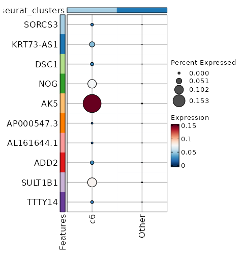 seurat_clusters: c6 Markers Showing top 100 markers ordered by p_val_adj ascendingly, then abs(avg_log2FC) descendingly. Use 'Download the entire data' button to download all significant markers by 'p_val_adj < 0.05 & avg_log2FC > 0'.