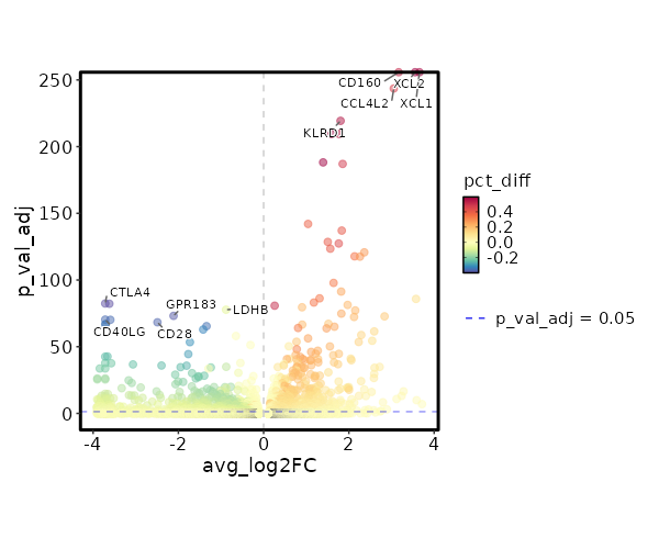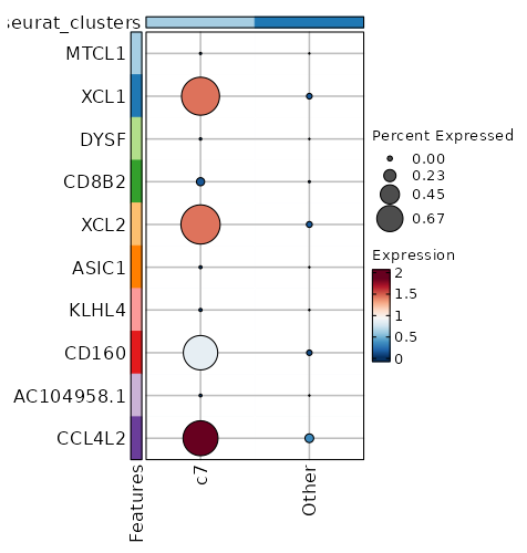 0 3.6553 0.652 0.074 0 XCL1 c7 0 3.5529 0.673 0.079 0 XCL2 c7 0 3.1674 0.587 0.071 0 CD160 c7 7.513e-249 3.0534 0.598 0.13 2.52e-244 CCL4L2 c7 1.374e-224 1.8049 0.773 0.224 4.607e-220 KLRD1 c7 8.878e-215 1.5924 0.913 0.329 2.978e-210 CD8B c7 9.567e-215 1.7687 0.876 0.339 3.208e-210 HOPX c7 1.938e-193 1.396 0.956 0.364 6.501e-189 CD8A c7 2.734e-192 1.8541 0.831 0.349 9.17e-188 CTSW c7 2.753e-147 1.0427 0.997 0.606 9.232e-143 CCL5 c7 2.598e-142 1.833 0.676 0.264 8.715e-138 CAPG c7 7.83e-134 1.5051 0.748 0.345 2.626e-129 ITM2C c7 1.273e-132 1.7618 0.773 0.334 4.27e-128 CCL4 c7 9.803e-129 1.5647 0.673 0.267 3.288e-124 AOAH c7 5.411e-126 2.3616 0.354 0.078 1.815e-121 SPINK2 c7 5.24e-123 2.134 0.513 0.167 1.757e-118 SPRY1 c7 9.29e-123 2.2599 0.363 0.086 3.116e-118 CD248 c7 4.438e-103 1.6412 0.535 0.2 1.488e-98 TMIGD2 c7 1.429e-96 1.8191 0.344 0.092 4.792e-92 CRTAM c7 1.638e-91 1.3126 0.66 0.318 5.494e-87 ITGA1 c7