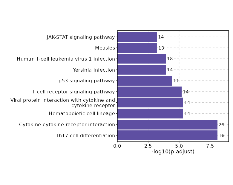 Enrichment Analysis Th17 cell differentiation 18/107 0 0 8.8186 209.6303 IL1R1;RUNX1;FOXP3;CD4;IL6ST;AHR;RORC;RORA;IL6R;CD247;LAT;CD3D;LCK;IL2RA;IL2RB;IL17F;IL21;JAK1 1 KEGG_2021_Human Cytokine-cytokine receptor interaction 29/295 0 0 4.8296 113.2624 IL1R1;IL1R2;CD4;IL10;IL16;CCL20;IL10RA;CD27;CCR8;CCR6;CCR4;IL32;IL17F;IL21;TNFRSF13B;CXCR5;FAS;IL6ST;CSF1;IFNAR2;IL6R;TNFRSF4;TNFRSF1B;IL7;TNFRSF18;TNFRSF14;IL2RA;IL2RB;LTB 2 KEGG_2021_Human Hematopoietic cell lineage 14/99 0 0 7.1193 117.5295 IL1R1;IL1R2;CD2;CD5;CD4;CSF1;IL6R;ITGA4;IL7;CD3D;CD37;IL2RA;CD44;CD59 3 KEGG_2021_Human Viral protein interaction with cytokine and cytokine receptor 14/100 0 0 7.0362 115.2444 IL6ST;CSF1;IL6R;IL10;CCL20;IL10RA;TNFRSF1B;CCR8;CCR6;TNFRSF14;CCR4;IL2RA;IL2RB;CXCR5 4 KEGG_2021_Human T cell receptor signaling pathway 14/104 0 0 6.7221 106.7184 CD4;PAK2;RHOA;IL10;VAV3;PTPRC;CD28;LCP2;CD247;LAT;CD3D;CTLA4;ICOS;LCK 5 KEGG_2021_Human p53 signaling pathway 11/73 0 0 7.6271 106.1157 SHISA5;FAS;CCNG2;BAX;BCL2;CD82;BBC3;CDKN2A;GADD45G;BCL2L1;SESN3 6 KEGG_2021_Human Yersinia infection 14/137 0 0.0001 4.9102 61.306 CD4;ACTB;FYB1;RHOA;IL10;ITGA4;RHOG;VAV3;LCP2;LAT;ARPC1B;CASP1;LCK;RAC2 7 KEGG_2021_Human Human T-cell leukemia virus 1 infection 18/219 0 0.0001 3.8823 48.4018 IL1R1;IL1R2;CD4;BAX;E2F3;B2M;HLA-A;HLA-E;CD3D;CDKN2A;JAK1;BCL2L1;MAD1L1;ETS1;LCK;IL2RA;IL2RB;ITGB2 8 KEGG_2021_Human Measles 13/139 0 0.0006 4.4404 47.6478 FAS;HSPA1A;BAX;SLAMF1;BCL2L1;IFNAR2;BCL2;CD28;CD3D;BBC3;IL2RA;IL2RB;JAK1 9 KEGG_2021_Human JAK-STAT signaling pathway 14/162 0 0.0006 4.0756 43.0198 PTPN2;IL6ST;STAM;BCL2L1;IFNAR2;IL6R;IL10;IL10RA;IL7;BCL2;IL2RA;IL2RB;IL21;JAK1 10 KEGG_2021_Human Human immunodeficiency virus 1 infection 16/212 0 0.0008 3.5241 35.8851 CD4;BAX;CALM3;GNG8;B2M;HLA-A;HLA-E;CD3D;RAC2;FAS;PAK2;BCL2L1;TNFRSF1B;BCL2;CD247;SAMHD1 11 KEGG_2021_Human Osteoclast differentiation 12/127 0 0.0008 4.4835 45.3238 IL1R1;SQSTM1;CSF1;IFNAR2;NCF4;SIRPG;JUNB;LCP2;SIRPB1;ACP5;LCK;JAK1 12 KEGG_2021_Human Lysosome 12/128 0 0.0008 4.4446 44.5859 CD164;LAPTM4A;LGMN;TPP1;CTSB;CTSA;CLTB;PSAP;ACP5;CTSC;LAPTM5;CLN5 13 KEGG_2021_Human Natural killer cell mediated cytotoxicity 12/131 0.0001 0.001 4.3319 42.4672 FAS;SH2D1A;HLA-A;HLA-E;IFNAR2;VAV3;LCP2;CD247;LAT;LCK;ITGB2;RAC2 14 KEGG_2021_Human NOD-like receptor signaling pathway 14/181 0.0001 0.0014 3.6083 33.7004 ANTXR2;GBP2;GBP5;BCL2L1;CARD16;CARD17;IFNAR2;GABARAP;CTSB;RHOA;BCL2;CASP1;NAMPT;JAK1 15 KEGG_2021_Human Apoptosis 12/142 0.0001 0.0018 3.9631 35.7607 FAS;BAX;ACTB;MAP3K5;GADD45G;BCL2L1;CTSB;BCL2;BBC3;CTSC;PARP1;SPTAN1 16 KEGG_2021_Human Sphingolipid metabolism 7/49 0.0001 0.0018 7.1094 63.7307 CERK;SGMS1;UGCG;KDSR;PSAP;SGPP2;SGPP1 17 KEGG_2021_Human Kaposi sarcoma-associated herpesvirus infection 14/193 0.0002 0.0023 3.3643 29.1339 BAX;CALM3;GNG8;E2F3;HLA-A;HLA-E;GABARAP;CCR8;CCR4;JAK1;FAS;IL6ST;IFNAR2;UBC 18 KEGG_2021_Human Cell adhesion molecules 12/148 0.0002 0.0023 3.7871 32.6887 CD2;CD4;HLA-A;HLA-E;ICAM3;ITGA4;PTPRC;CD28;CTLA4;ICOS;ITGB2;TIGIT 19 KEGG_2021_Human Autoimmune thyroid disease 7/53 0.0002 0.0024 6.4899 54.8998 IL10;FAS;CD28;CTLA4;HLA-A;HLA-E;TSHR 20 KEGG_2021_Human