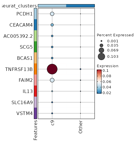 seurat_clusters: c9 Markers Showing top 100 markers ordered by p_val_adj ascendingly, then abs(avg_log2FC) descendingly. Use 'Download the entire data' button to download all significant markers by 'p_val_adj < 0.05 & avg_log2FC > 0'.